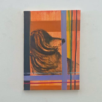 なぜこんなことを言うかといいますと、南谷理加さんの個展をレビューするにあたって、説明できない魅力を携えた「考えるな感じろ」的な作品を前に、私の現在の能力では到底、画像付き感想文の域を出ないものしか書けないとはじめから分かっているからです。SNSで過去の展示作品を見て、描かれているものは「犬」とか「人」とか言える程度に具象化されているにもかかわらず、作品全体の持つ抽象性と、画面構成の完璧さに驚きました。本展をぜひ見たいと初日に伺った後、次の日に作品を求めに再訪しました。要は「何だかよく分かんないんだけど良い」ってことです。