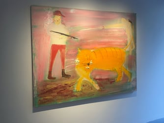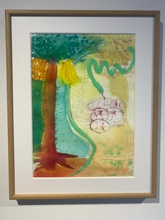 つぶらで簡略化された瞳の動物や裸の人物。筆跡が残る背景。子供の絵のような要素があるのに、子供の絵ではないとひと目で分かる画力、構図や色彩。