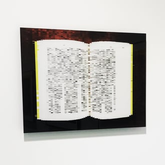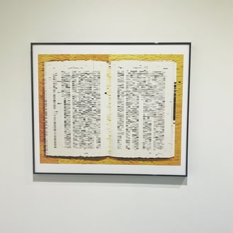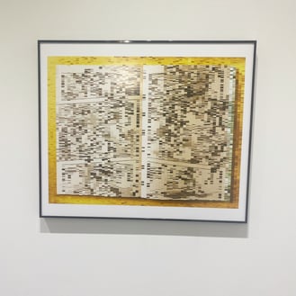 画像が粗い?わけではないとわかると思います。単に画像が粗い場合は正方形のモザイクになりますが、これらは横に長い長方形で描かれたデジタル作品です。何かのプログラムを組んで一斉に変換しているのでもありません。写真画像をもとにして描画ツールで長方形を無数に描いています。面白いのはこれらの粗い情報でも、何となく元の画像が文庫本だったり、漫画のコマ割りだったり、五線譜だったりするのが予想できることです。