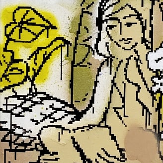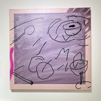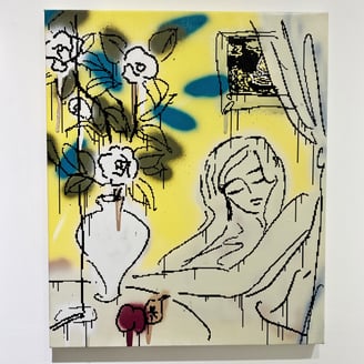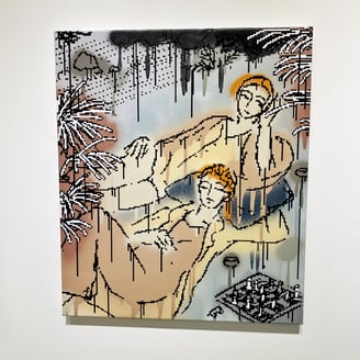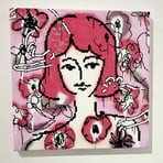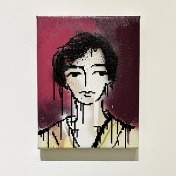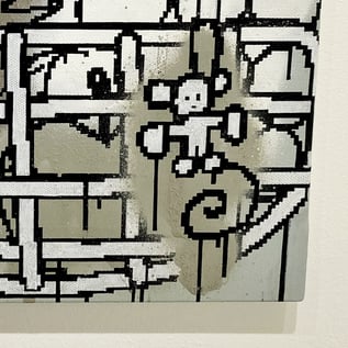 彼女の作品の一番の特徴と言えるのは、一見するとデジタル上の作品と勘違いする思うような、ピクセルを模した黒い線です。小さい頃よりPCに入っていたペイントツールで描くことに慣れ親しんでいたというhinさん。作品制作はiPadで描くところから始まります。iPadで描画された作品を元にスプレー等で色付け、黒のラインは手描きやシルクスクリーンでキャンバスに「再現」されています。PCで見る画像と実際の作品の印象の差が大きい作家さんです。実際の作品の方がよりオーラを感じました。