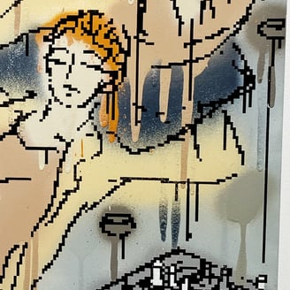 デジタルとアナログの感覚を繋ぐ重要な表現として、hinさんのオリジナル技法 ”virtual spray” が挙げられます。ここまで触れずにいましたが、ピクセルの線がスプレーの塗料と同じように垂れている、一番初めにそこに注目される方も多いと思います。