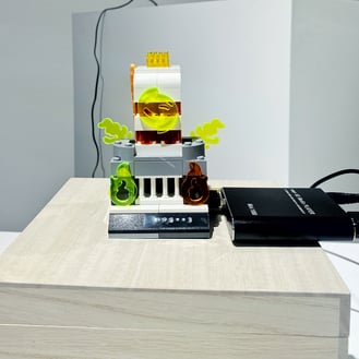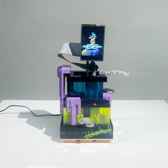 ブロックとアクリルで制作した墓形USBメモリの中には映像データが入っており、リアルタイムで再生されています。それぞれの映像は "ゲームエンジンの射撃アセットで制作した墓参りの主観映像" "ボクセルとVRペイントツールで制作したデスクトップ型墓の回転モデル" "地獄の番犬ケルベロスの2Dアニメーション"です。