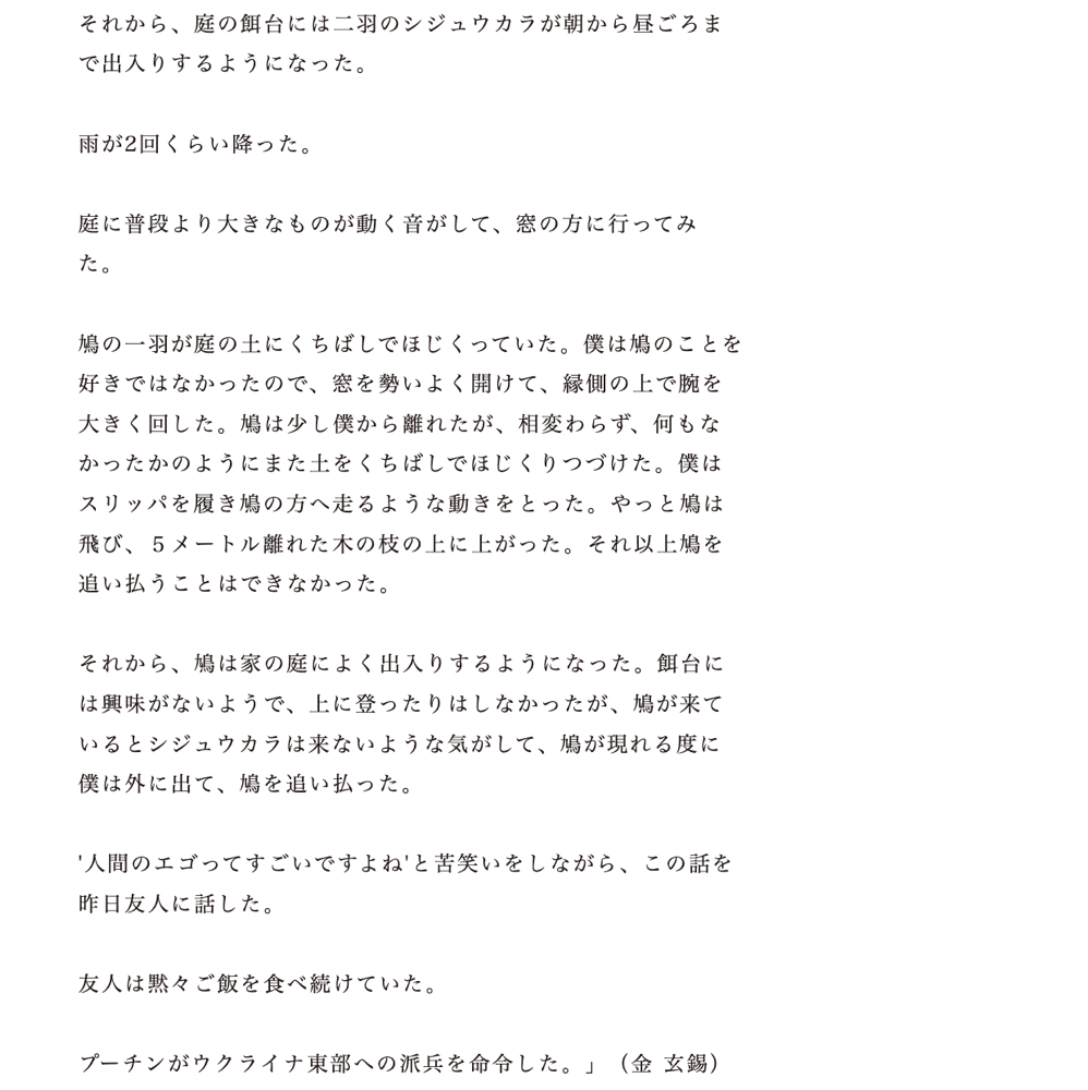 引っ越した家にある小さい庭。そこに餌台を取り付け鳥を待つ作家。餌はひまわりの種のみで、みかんを置いた方がいい等のアドバイスには気乗りがしない。ある日、シジュウカラがやってきて、、、