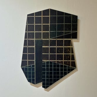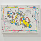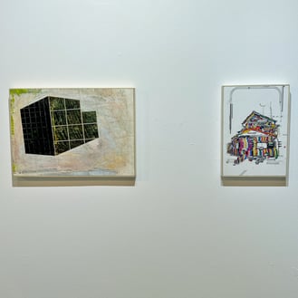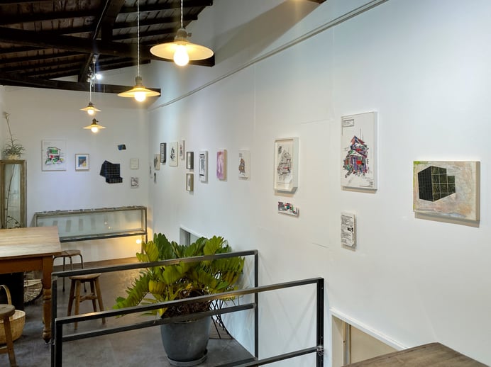 制作の過程に様々な動作を経るという共通点のある2人ですが、完成した作品は違った表情を見せます。違っていながらも並んで展示されると調和していて、モチーフの角張った輪郭や、石部さんの縦横斜め引かれた線とchappyさんの格子状の線などに共通点も感じます。