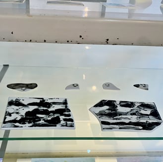 石部さんの陶芸作品。インクをスキージで刷って地平線のような線を生じさせることで、風景画のように見える作品があることから、釉薬でも同じような工程を試したそう。確かに白黒の風景写真に見えます。