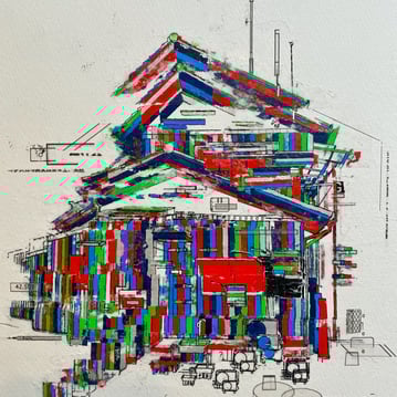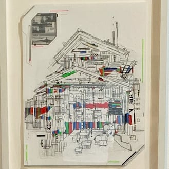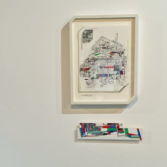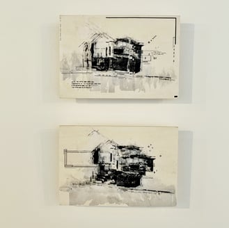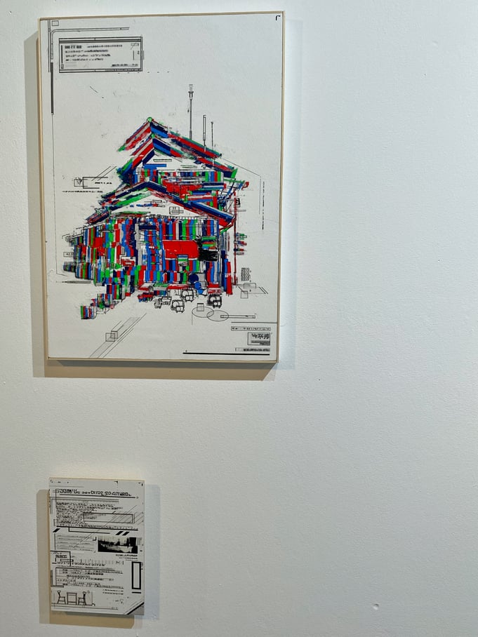 石部さんは昭和後期の時代に日本でよく建てられた一般的な家屋に魅力を感じるそうです。他の国でもあまり類を見ない建物、とおっしゃっていました。その建物を描き、塗り、刷る、切る、剥がす、転写するなどの工程を経て、ノイズが加わった独特な作品を制作されています。