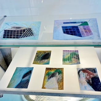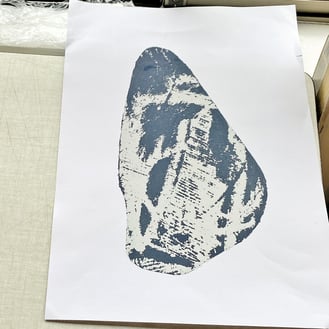 石部さんの作品の部分拡大です。剥がす、転写するの過程で紙の繊維が混じることにより、アナログの工程でしか出せない作品の妙となっています。