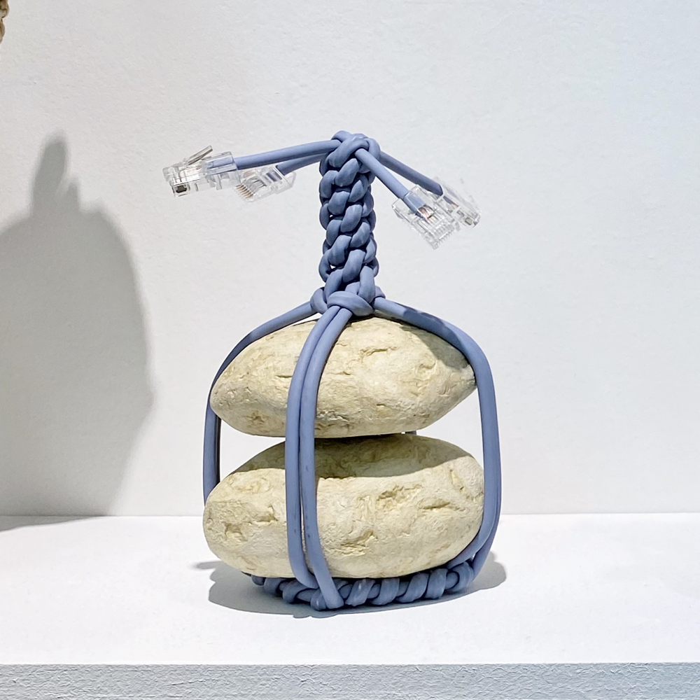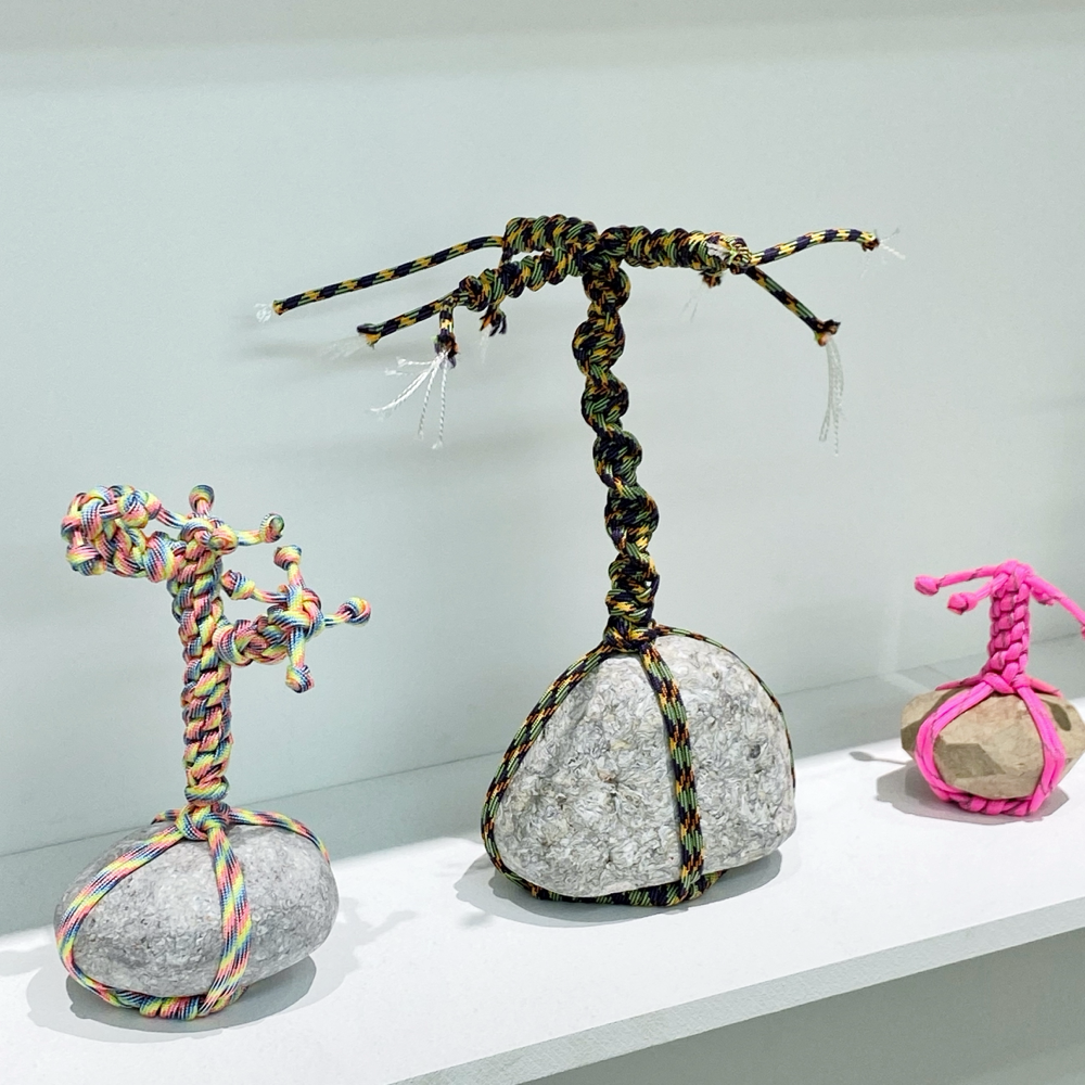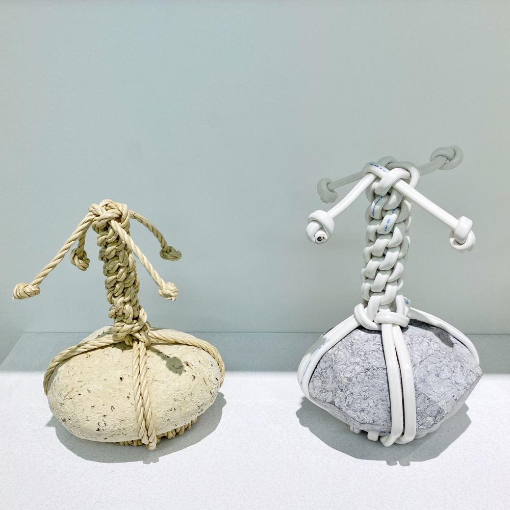 この「関守石」には現代ならではの紐が使用されていてビニル素材のものやLANケーブルなどもありました。軽量な「還魂紙」だから可能な、石が宙に浮いたように組み込まれた盆栽のような姿は、従来の「関守石」では見られないものでしょう。