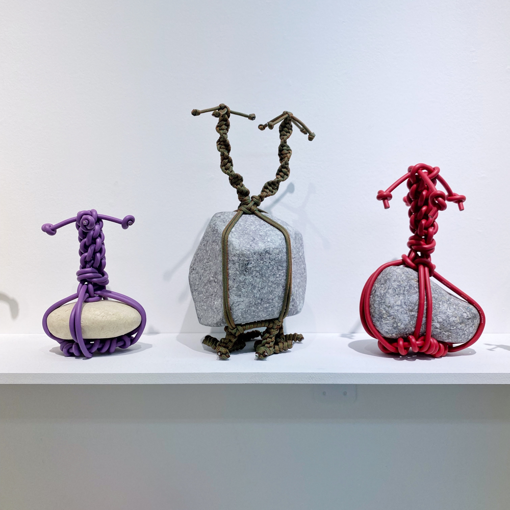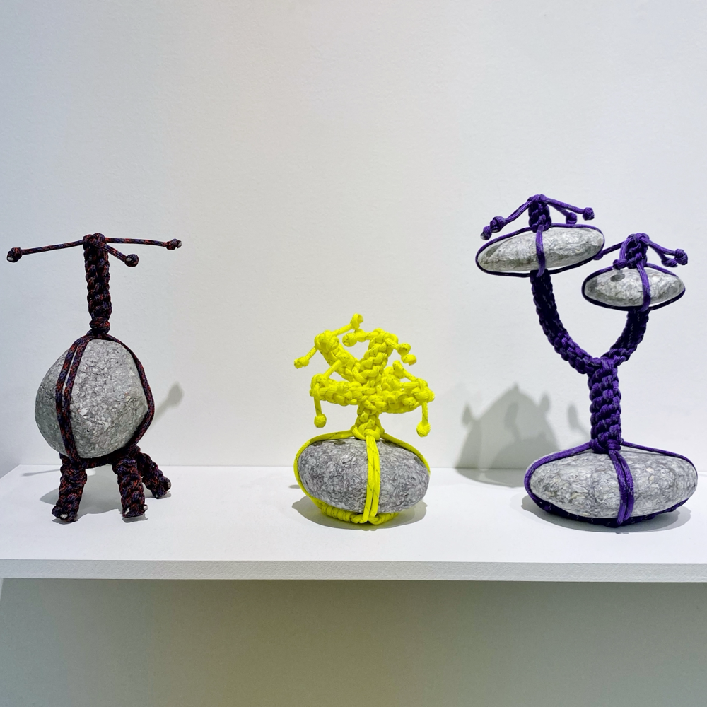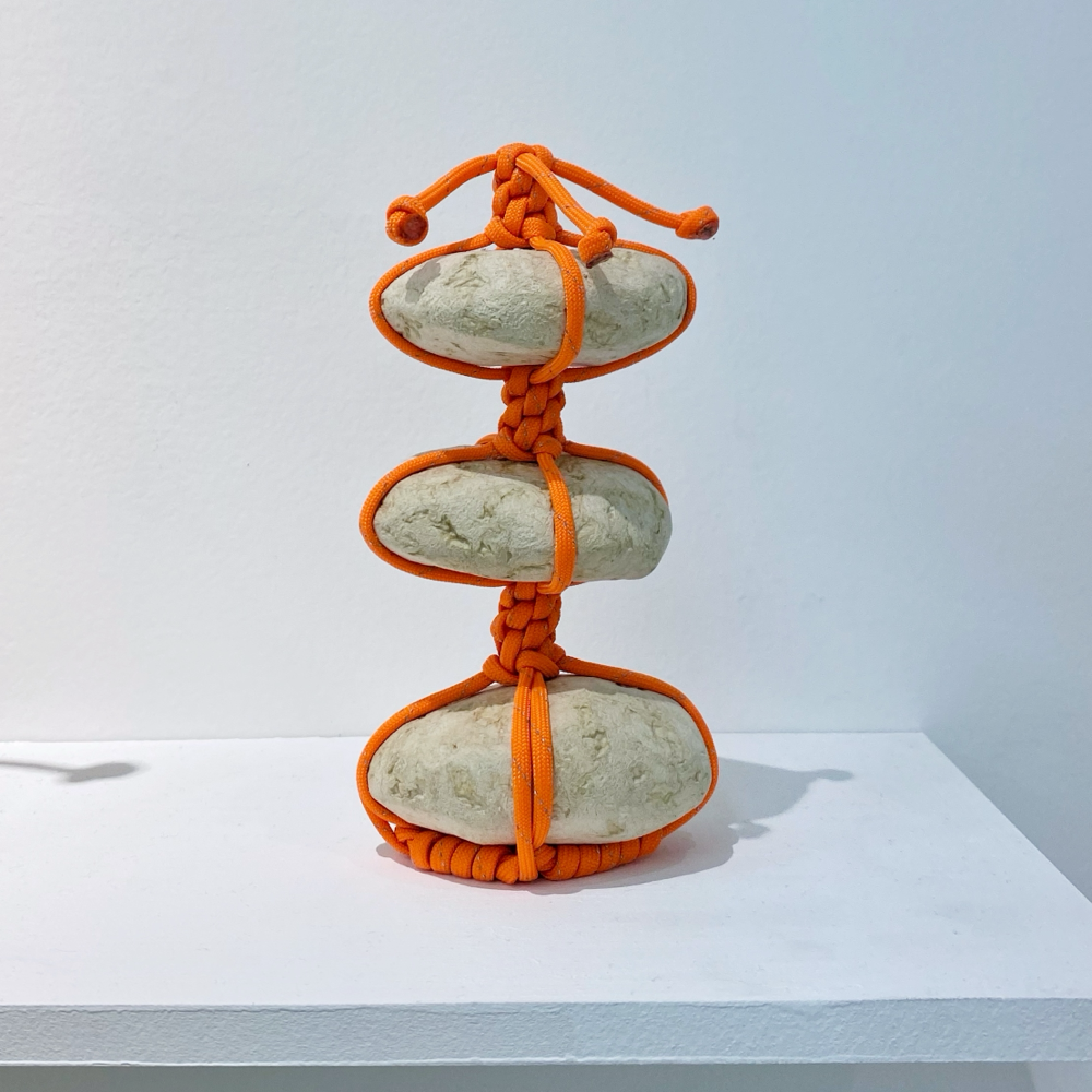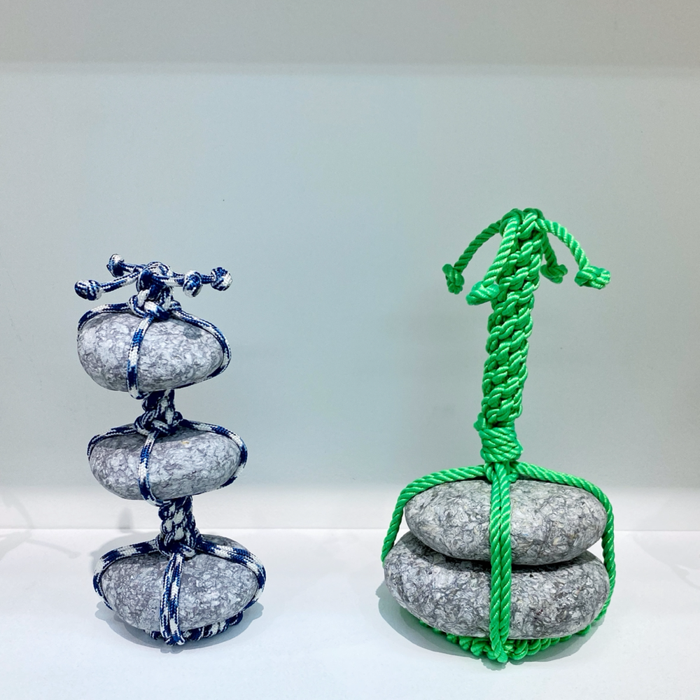この「関守石」には現代ならではの紐が使用されていてビニル素材のものやLANケーブルなどもありました。軽量な「還魂紙」だから可能な、石が宙に浮いたように組み込まれた盆栽のような姿は、従来の「関守石」では見られないものでしょう。