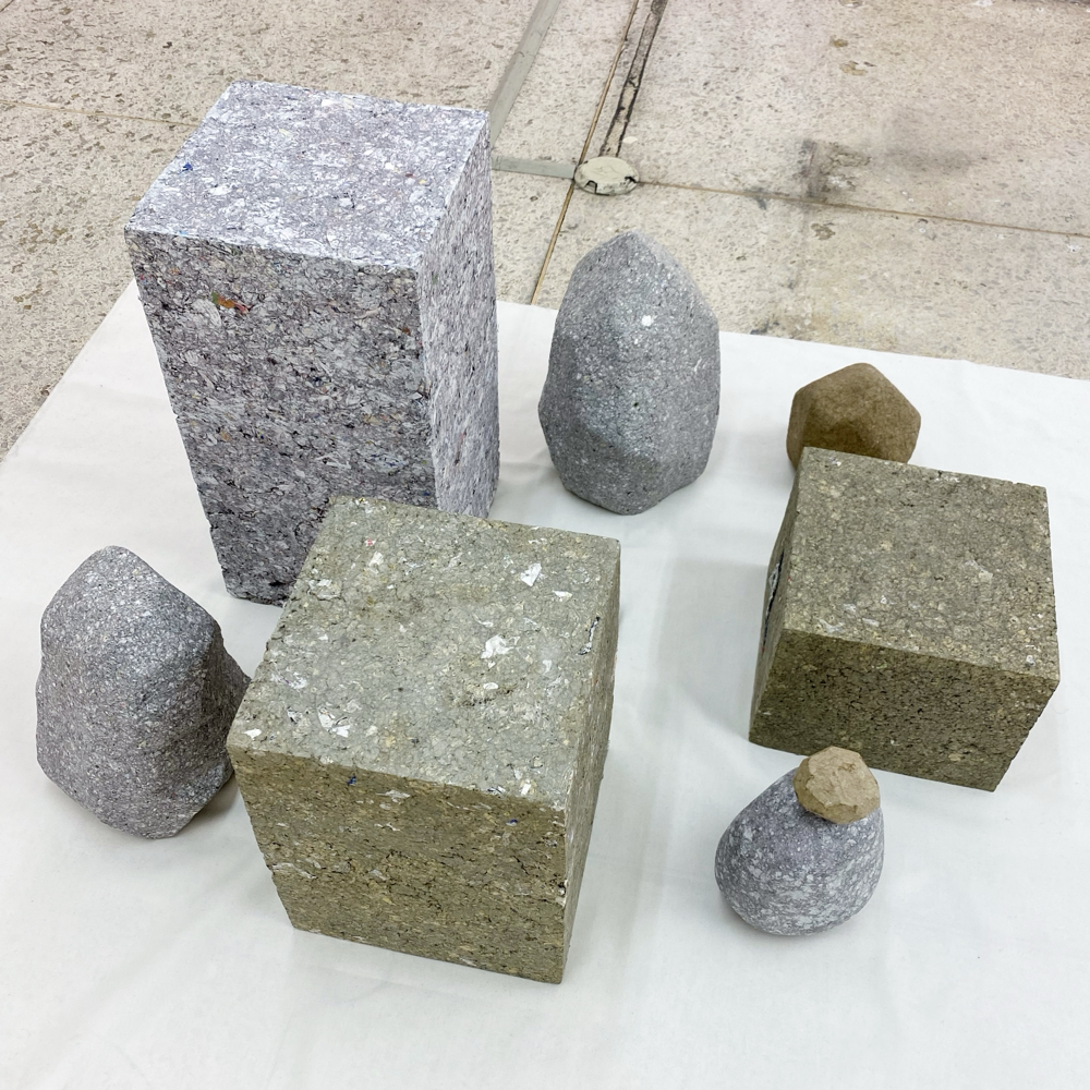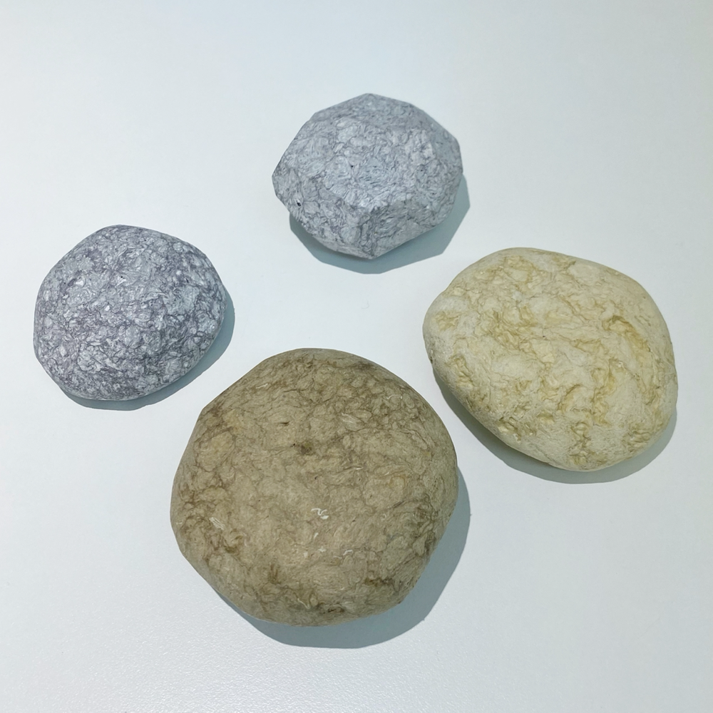下の画像、青みがかったグレーの上2つは雑誌等の紙から再生されたもの、右の明るいクリーム色のものは和紙から再生、下の濃い茶はダンボールから再生したものだそうです。