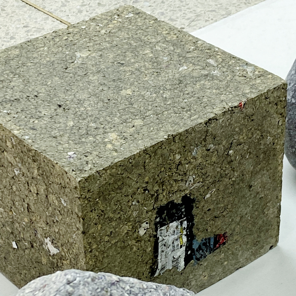 展覧会画像の前に、いつもより文の分量が多くてすみませんが今しばらくお付き合いください。このすごい経歴の3名からなるコレクティブであるKMNR™は「還魂紙」を使用した作品を制作しています。「還魂紙」とは、江戸時代以前より存在した紙で、使い古した紙を漉き直し再生した紙のことを言います。中国からきた言葉だそうで、日本に伝わった際に「還魂」という字になぞらえて魂まで還元されると捉えられました。鎌倉時代には遺灰を漉き込んだ紙のことを言ったそうですが、江戸時代には八百万の神といった思想から紙そのものにも魂があるとされ、手漉きで再生された紙を「還魂紙」と呼ぶようになったそうです。紙が辿ってきた歴史や思いが漉き込まれているという考えがとても日本的であるとも言えます。