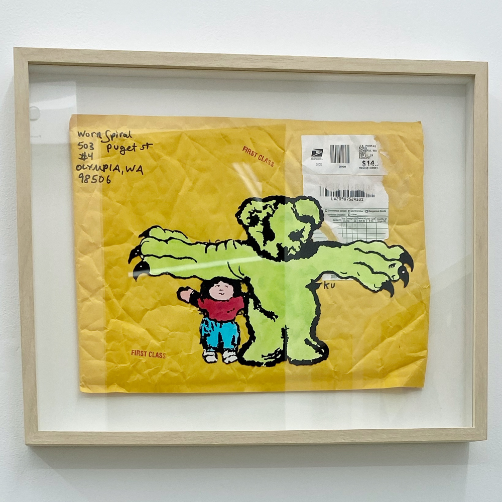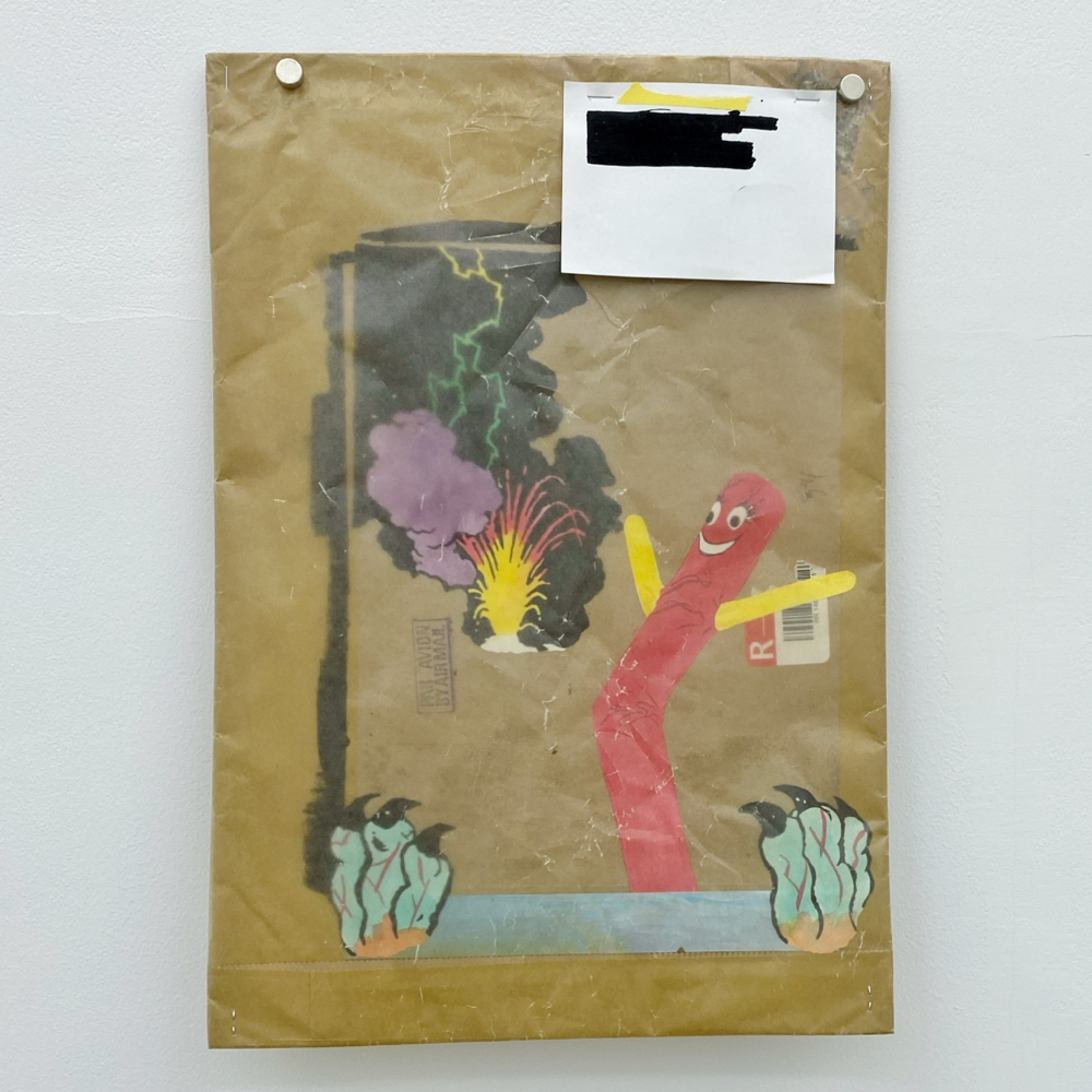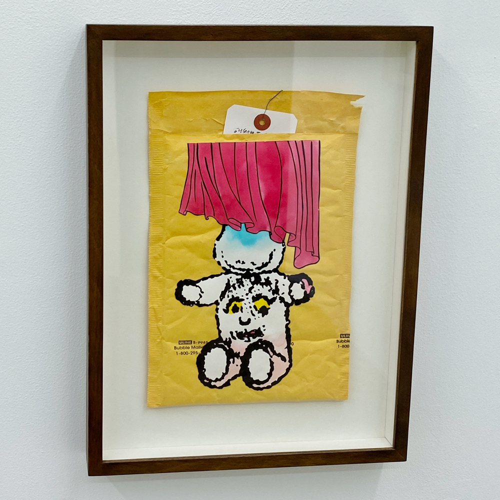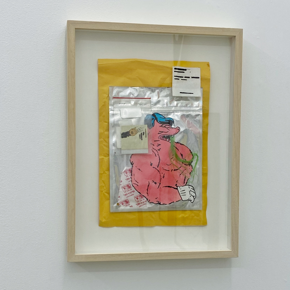 重なった袋、トレーシングペーパーを重ねることで透けて見える印字部分、海を渡ってきた途中でついた封筒のシワ、アメコミっぽい絵柄、ハードコアマガジンのような文字、など、本展のタイトル「wackycore」が一番感じられる作品群と思いました。