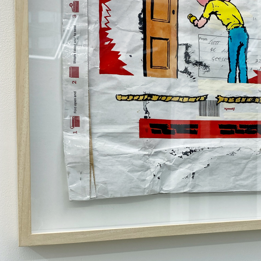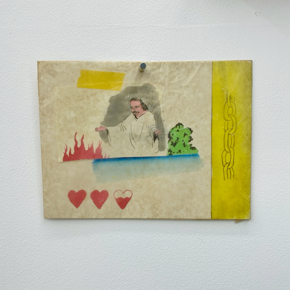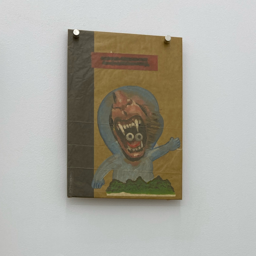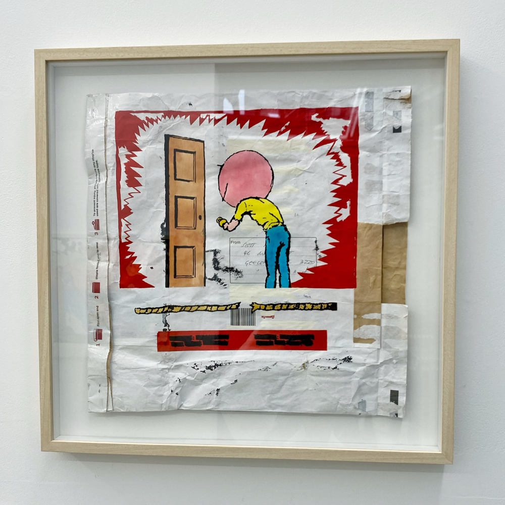 重なった袋、トレーシングペーパーを重ねることで透けて見える印字部分、海を渡ってきた途中でついた封筒のシワ、アメコミっぽい絵柄、ハードコアマガジンのような文字、など、本展のタイトル「wackycore」が一番感じられる作品群と思いました。