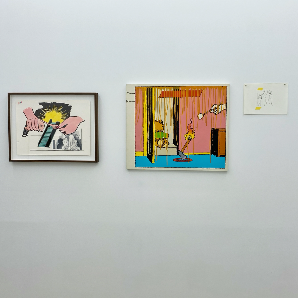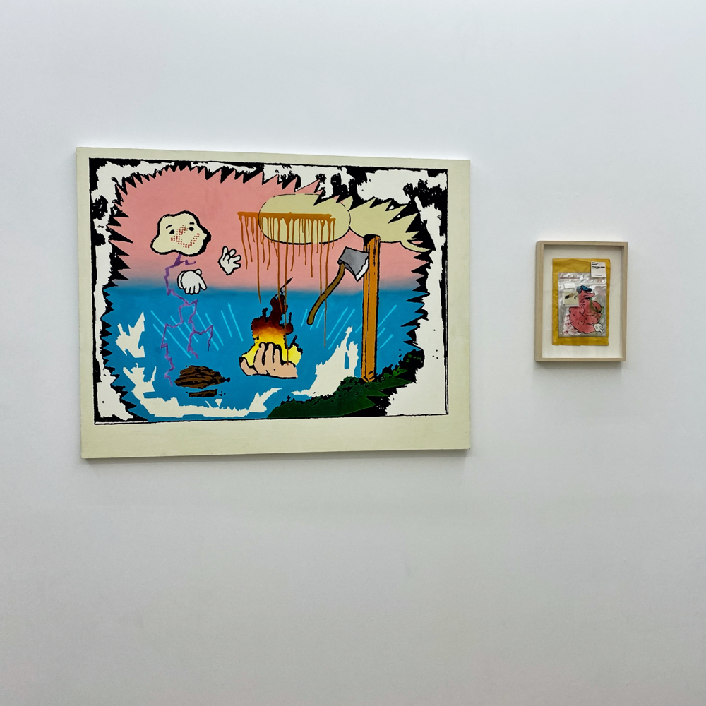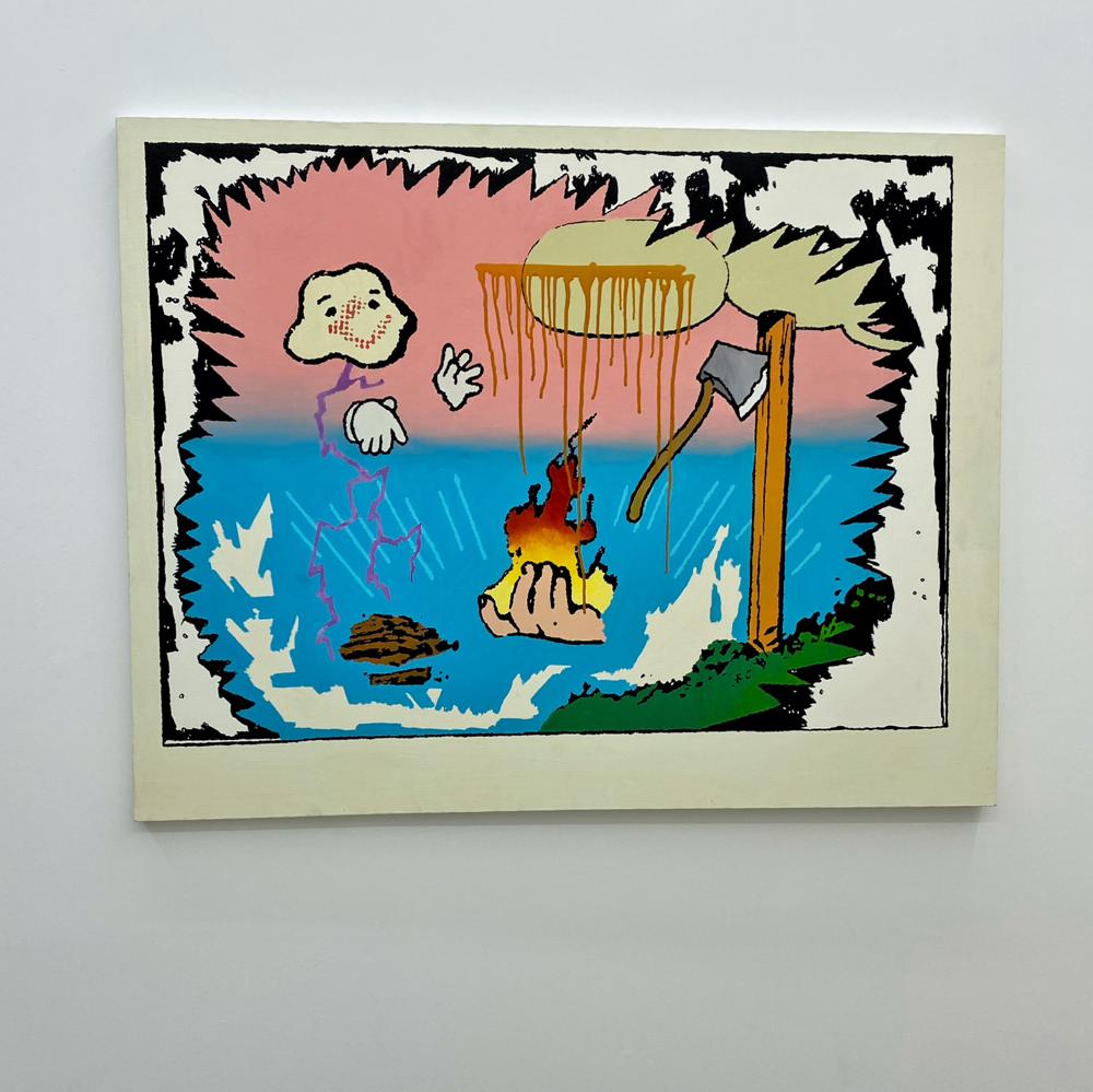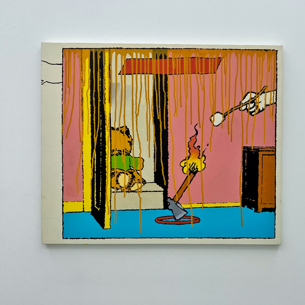 このペインティングシリーズには加えて、禅問答、なぞかけを思わせるような場面が描かれていて、炎、斧、円 (球体、丸) というようなモチーフが繰り返し出現しています。もやのように垂れている黄土色の絵の具も共通点です。ノイズのような、はっきりしない視界が、夢の世界、不穏さなどを感じさせます。