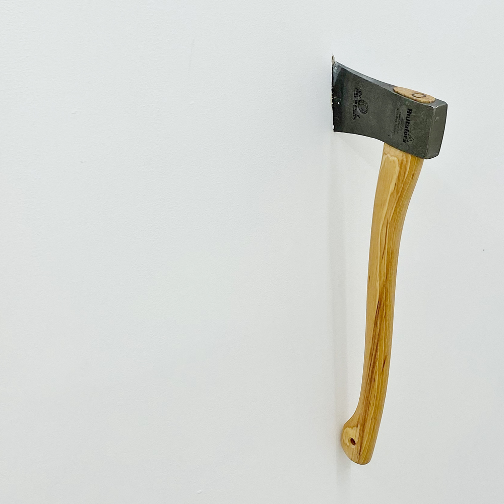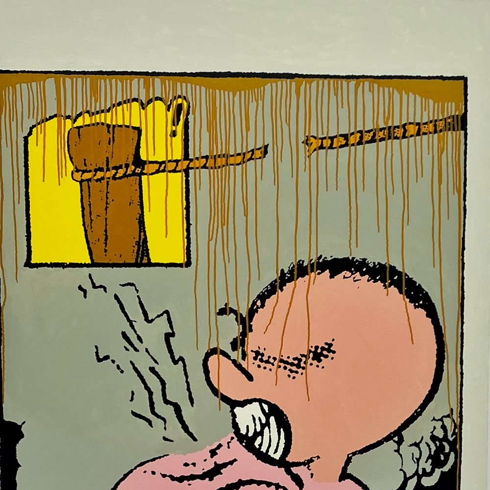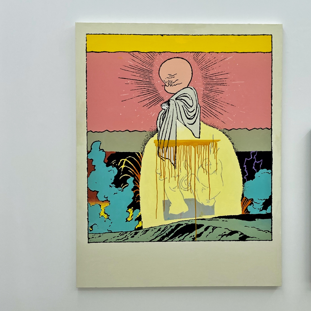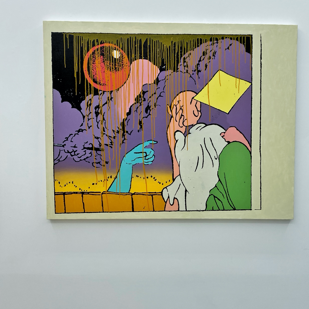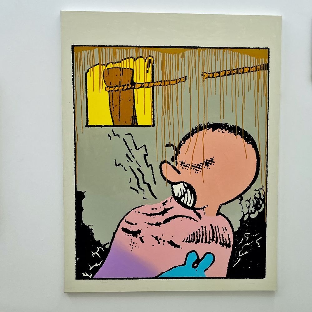 このペインティングシリーズには加えて、禅問答、なぞかけを思わせるような場面が描かれていて、炎、斧、円 (球体、丸) というようなモチーフが繰り返し出現しています。もやのように垂れている黄土色の絵の具も共通点です。ノイズのような、はっきりしない視界が、夢の世界、不穏さなどを感じさせます。