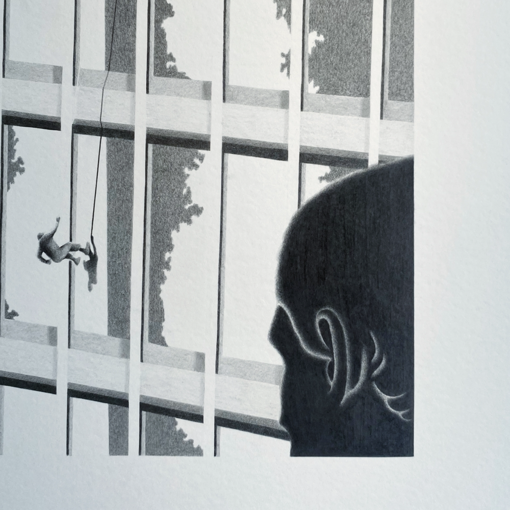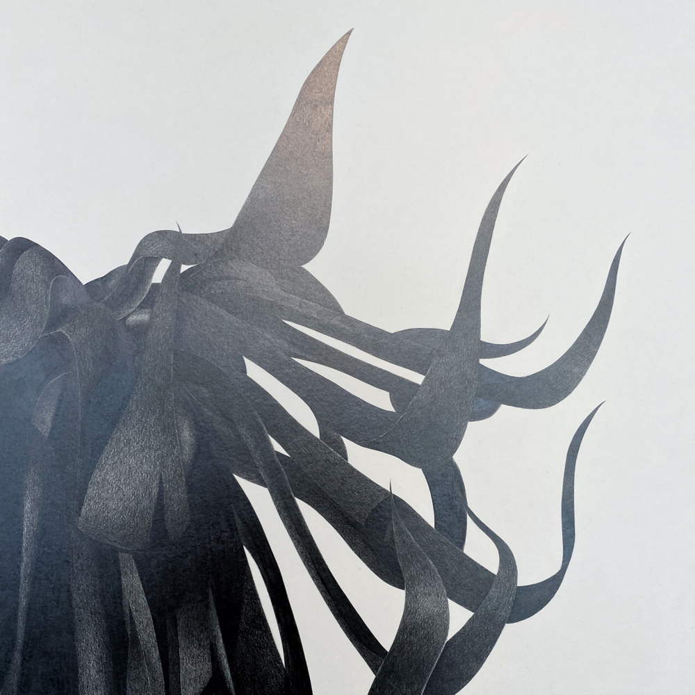 "Gray Scale"という本展タイトルにも表れているように、片寄さんの作品は、基本的にシャープペンシルのみで描きあげるという超絶技巧のモノクロ画面が特徴です。