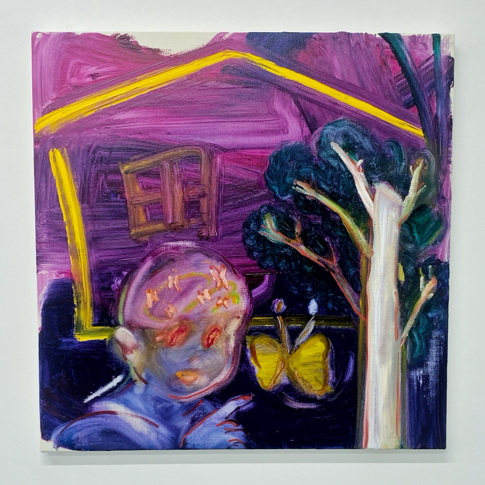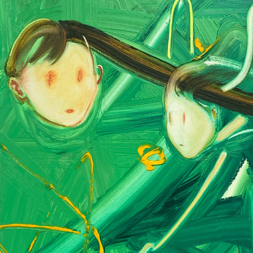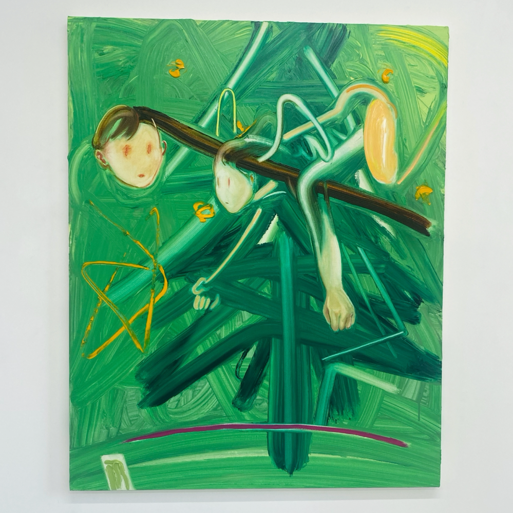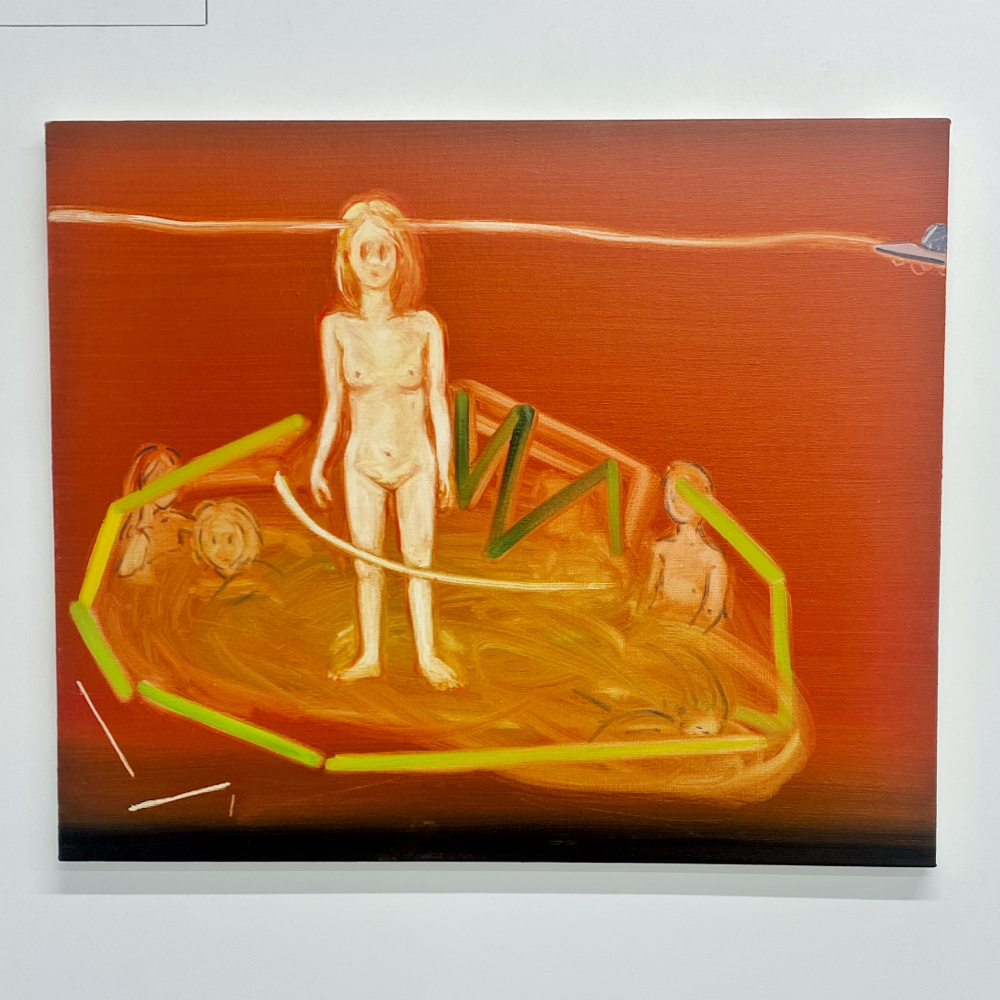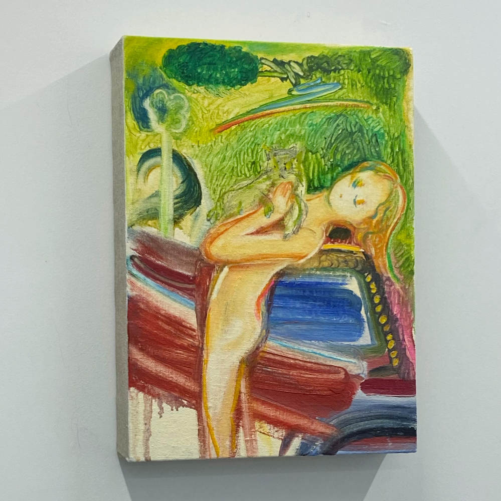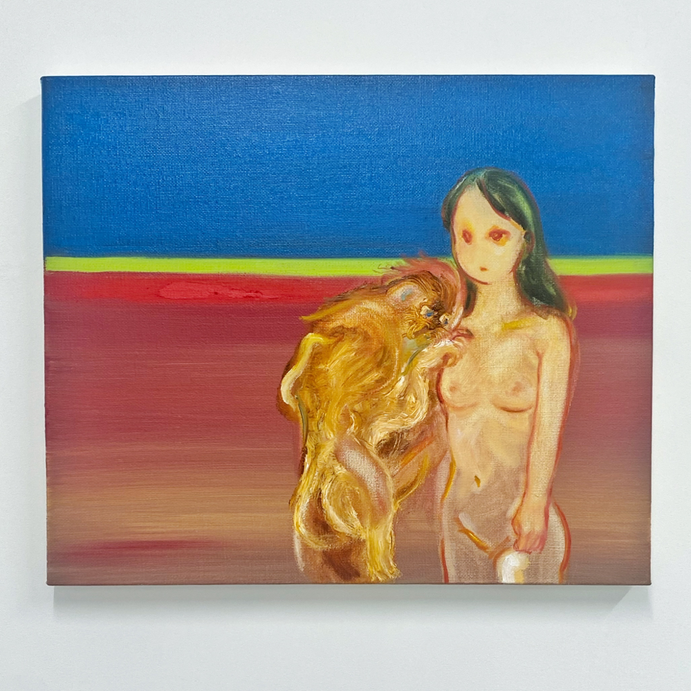 そうした類似性が、たとえば愛や影響の次元で映るか、世界観として劣ったものになってしまうかは、フカミ自身の作品の強度による。一方で、イメージを生のまま定着させる即時性は、どうしても絵を記号的に荒く留めてしまう可能性もある。先のテキストで石井が述べているように、記号化は単調化にも通じている。そこで、技術的着地点をどこに持っていくかは難しい問題なのではないか。これは《思い出したら》(2022)に出てくるネコが、ぱっと見て、ネコと分かりづらかったり、花の活き活きとしたそよぎが、いまいち伝わらない、という単純な話である。フカミのリアリティが十分表現出来ているから良いのか、それとも万人にわかるように描けた方が良いのかはわからない。しかし、エドヴァルド・ムンクでも、シャガールでも、ミリアム・カーンでも、ちゃんといい塩梅で描くような気がする。