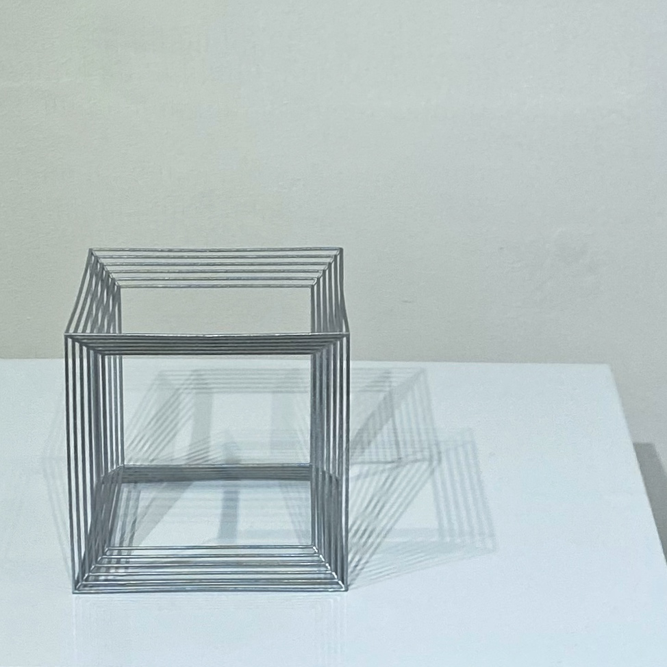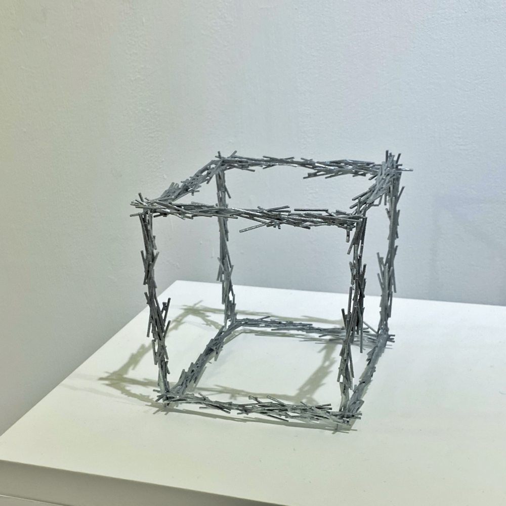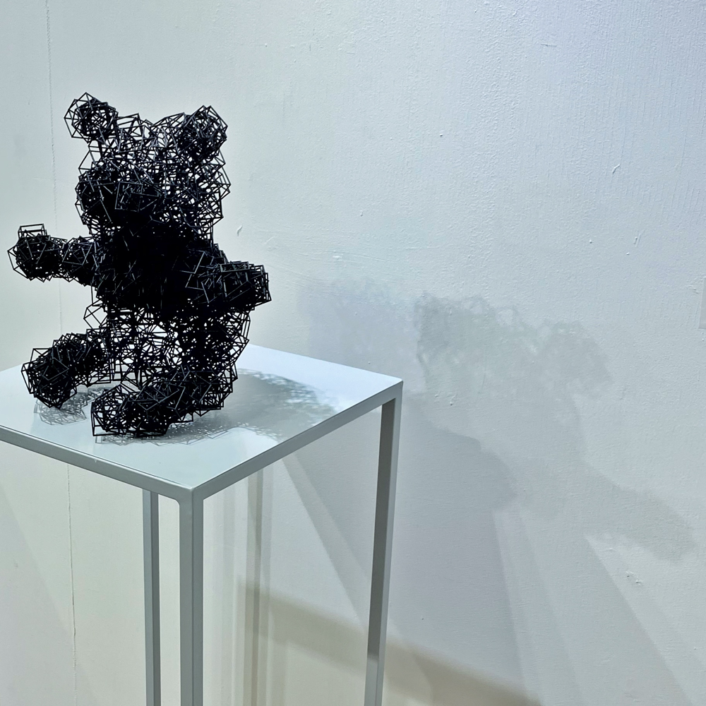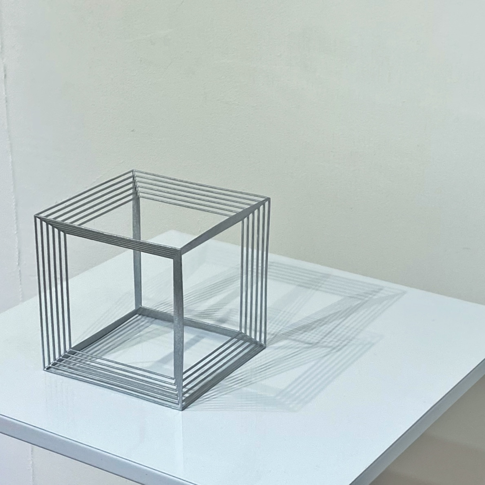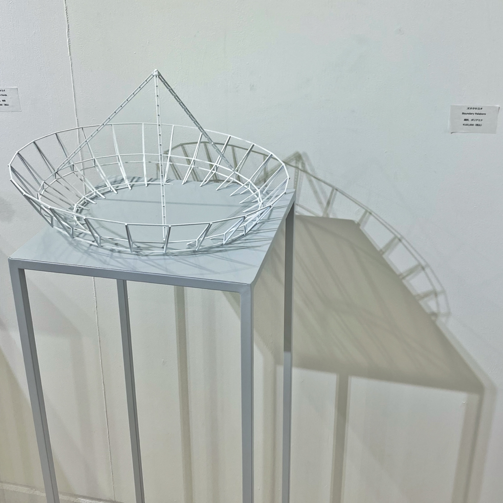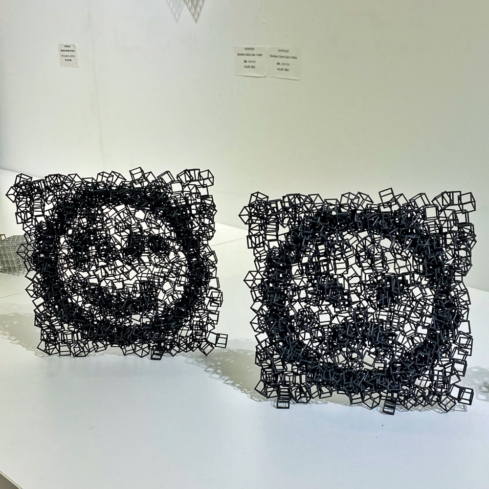 Boundaryは境界という意味です。2021年に同Gallery TK2で開催した個展「Boundary」は、Gallery TK2さんのYouTubeチャンネルにて、オオタさんが「キューブが壁を境界を突破する姿を見ることで、少しでも前向きな気持ちになれればいいなと思って作っています」と言及しているように、コロナ禍の最中で外出も制限されていた時期もあって、多くの人が感じていた鬱蒼とした暗い気持ちから解放されるよう、勇気づける作品シリーズでした。台の中に溶け込むような、または、台から飛び出してきたような形になっているのはそういう文脈があってのことなんですね。