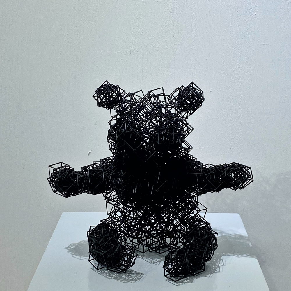 こちらの作品の素材は「石墨、樹脂」となっています。え、石墨ってグラファイト、鉛筆の芯の素材ですね。それを3Dプリンターでカットしたのでしょうか。樹脂で固めている? とは言え、パキっと壊しちゃいそうで緊張しますね。子供が鉛筆でぐるぐるとパンダを描いた、みたいに見えてきました。