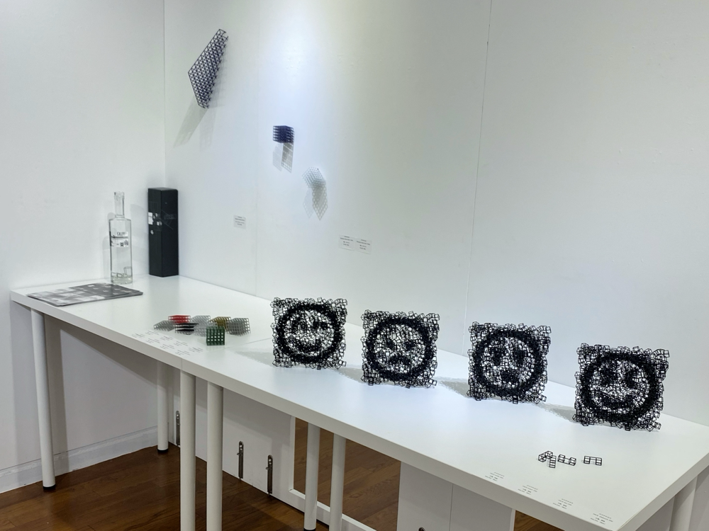 キューブで表された喜怒哀楽。この作品群の素材も「石墨、樹脂」です。キューブという規格で構成されているのに、最終的に浮かび上がる顔文字の像が、まるで子供が鉛筆をぐるぐるして描く絵のように実際のマークよりも安定してないところが面白い。四角四面というと、生真面目、面白みに欠ける、堅苦しいという意味になりますが、四角という形は自然界に存在しない、人工物の象徴という見方もありますし、一番「人間臭い」形なのかもしれません。