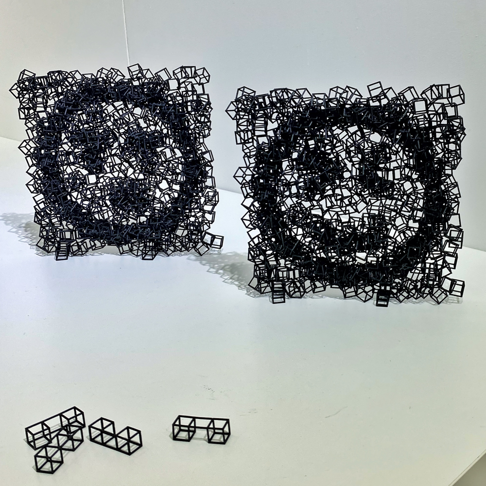 ブレイク前夜#305 のインタビューで「構造の美しさが端的に表れているのがキューブの形だと思う」「キューブって空間にみっちり敷き詰められる最小単位」「逆に言うとキューブだけで世界を作れる」と発言されているように、オオタさんの作品は、キューブを積み上げたり組み合わせることで様々な形へと形成されています。