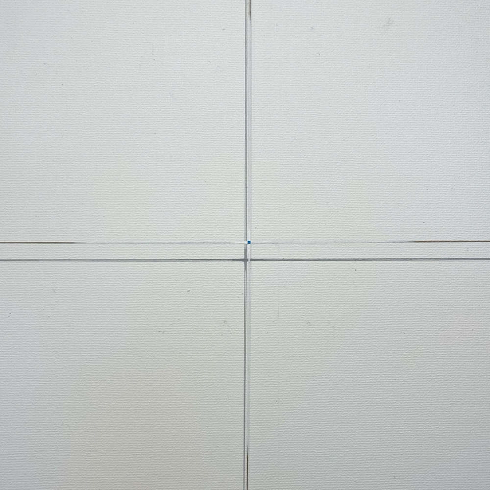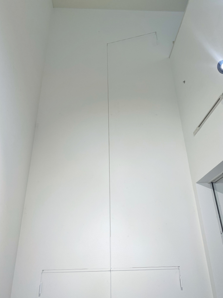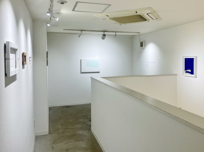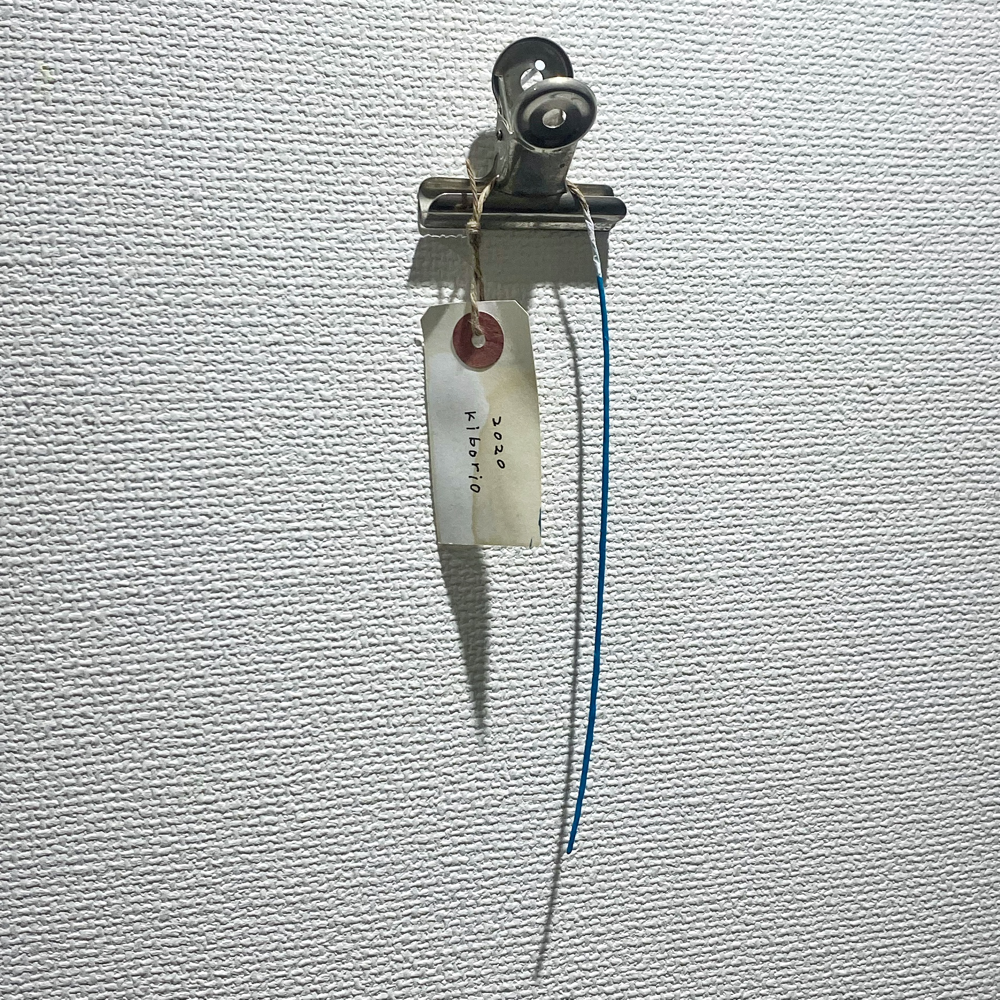 説明がくどいようで申し訳ないですが、この「青い四角 #1」の作品サイズは「4mm square」です。作品リストにそう記載があったので間違いないです。オモリや麻紐の大部分は作品ではありません。「十字架みたい」とか「キリストの磔刑を連想」なんて感想は見当違いです。4mm角の作品を飾る場所なんてたくさんありそうに思いますが、いや、天井高を確認しないと、、、。こちらの作品を購入した場合は、支持体部分は可変で設置してもらえるそうです。