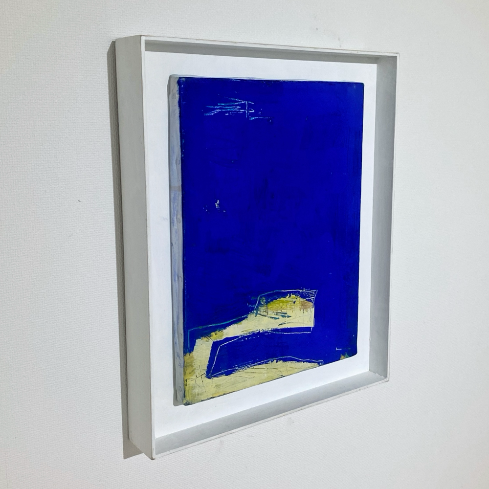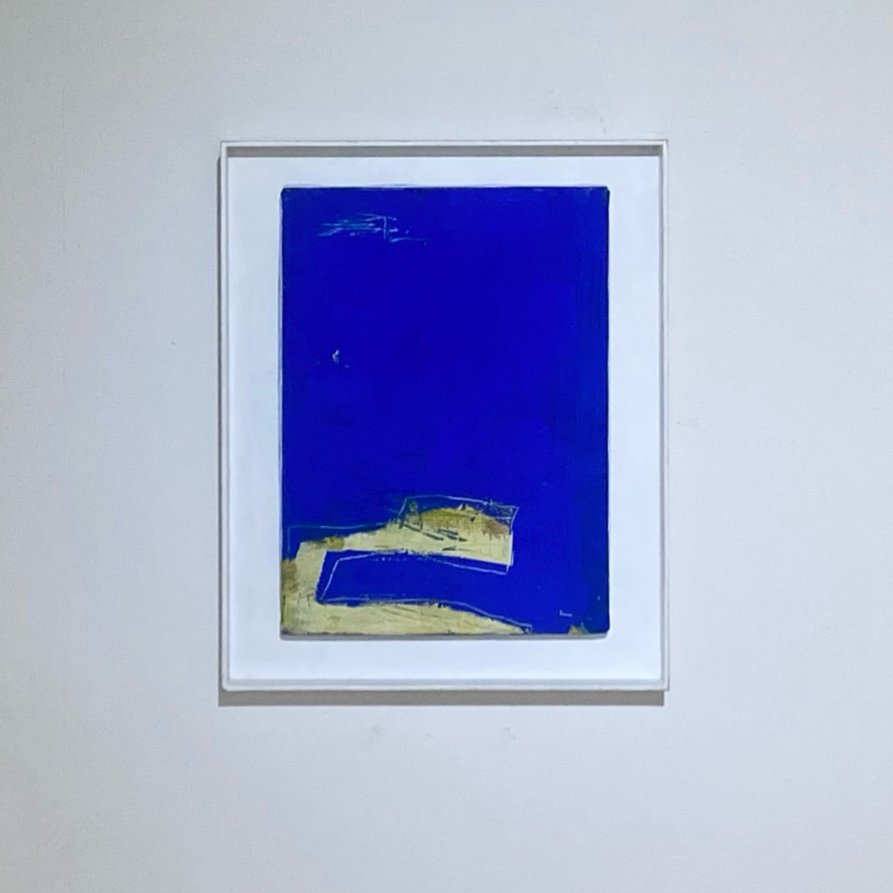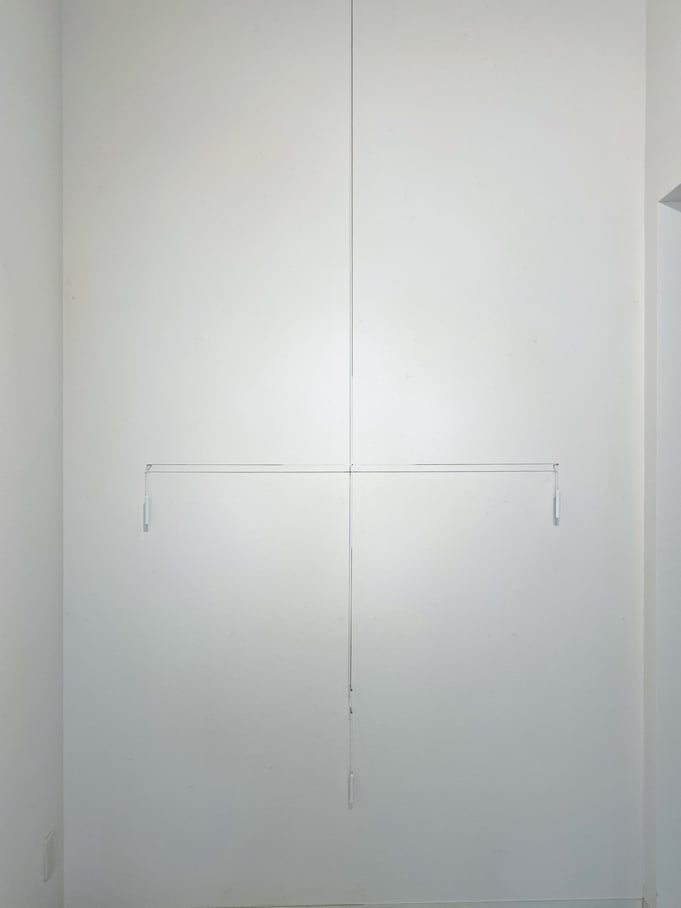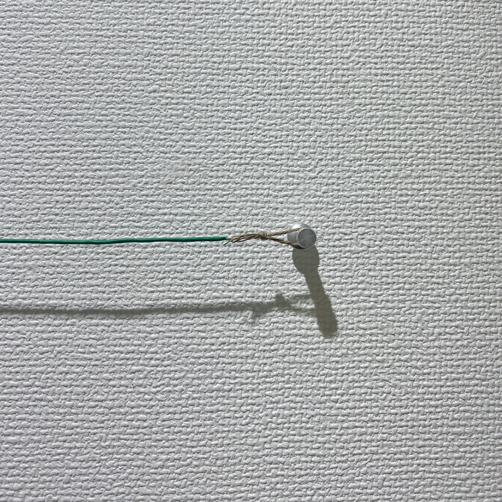 説明がくどいようで申し訳ないですが、この「青い四角 #1」の作品サイズは「4mm square」です。作品リストにそう記載があったので間違いないです。オモリや麻紐の大部分は作品ではありません。「十字架みたい」とか「キリストの磔刑を連想」なんて感想は見当違いです。4mm角の作品を飾る場所なんてたくさんありそうに思いますが、いや、天井高を確認しないと、、、。こちらの作品を購入した場合は、支持体部分は可変で設置してもらえるそうです。