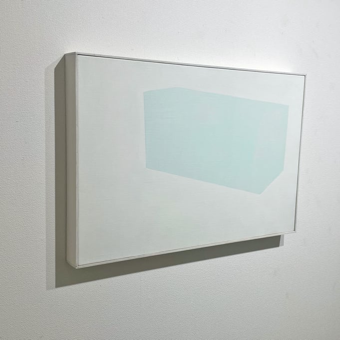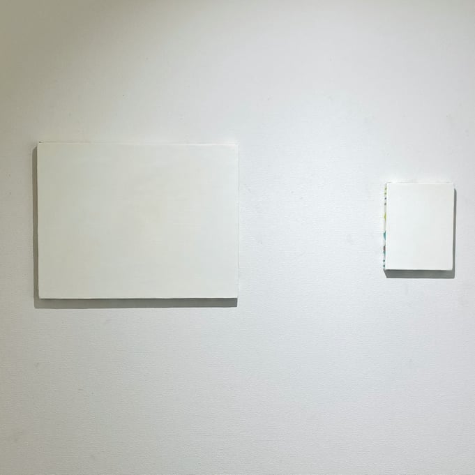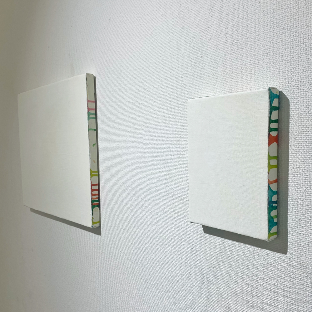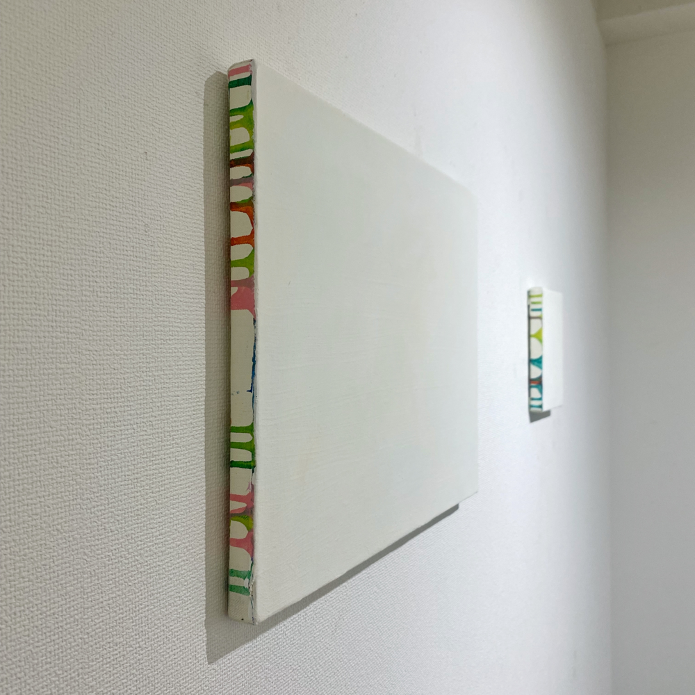 この「白い四角 #3」「白い四角 #4」を額装するとしたら側面が見えるようなボックス型の額に入れてしまいそうですが、これも皆が何となく了承している「平面」という概念の作品なので、作品リストにも幅 (W) と高さ (H) の表記はあっても厚さ (D) はないです。この側面は本来「ない」ものです。でも実際はあるじゃないか? という話ですが、作品タイトルからも推察できるように、少なくとも側面は「作品ではない」部分です。額装時に隠れて見えなくなってもよい部分と言えますが、果たして、そう飾る人は何人いるでしょうか? 私もこの側面が見えるように飾ってしまうと思います。