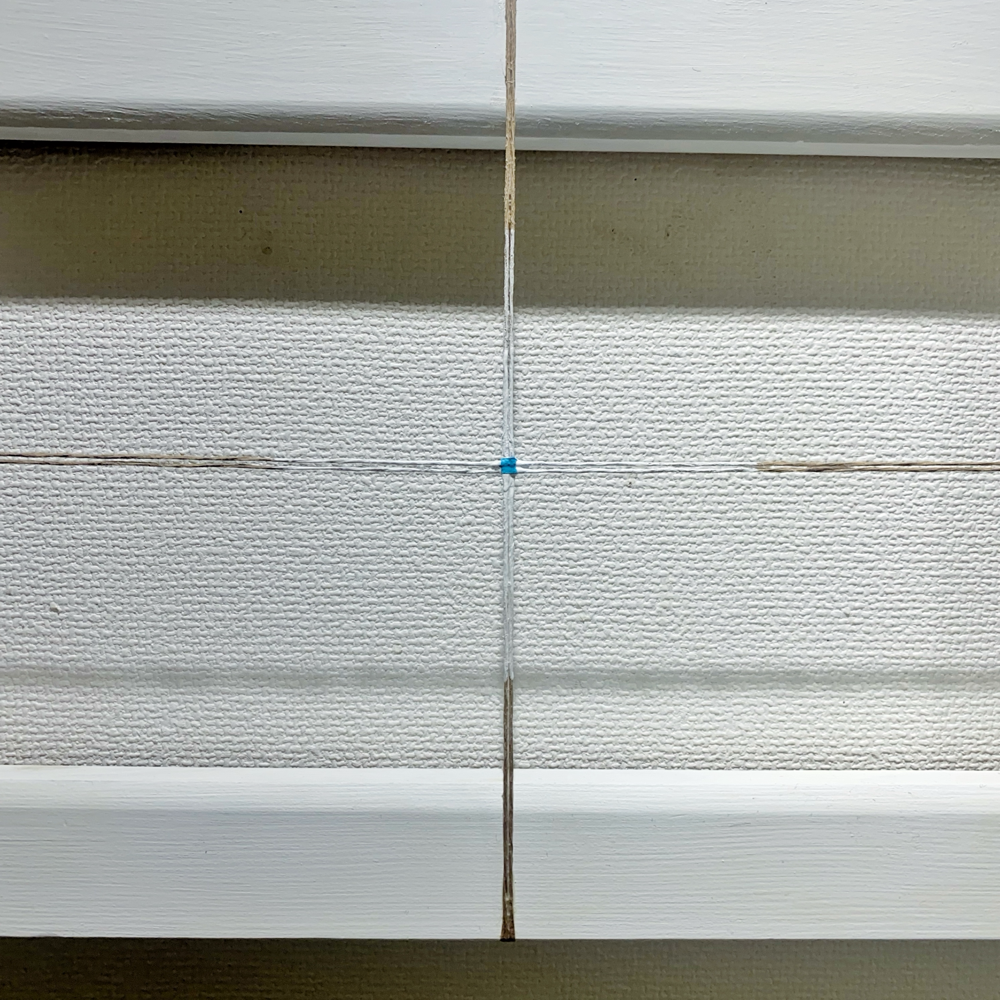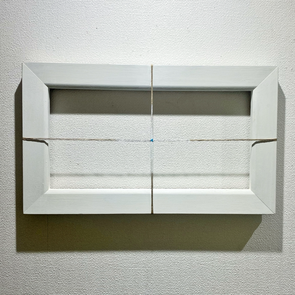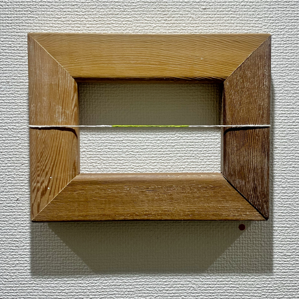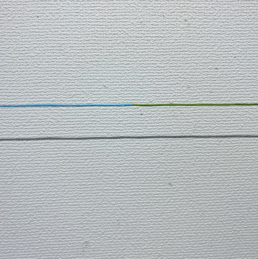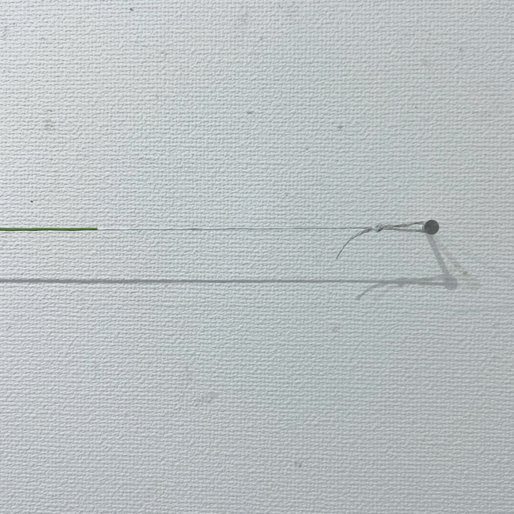 オモリ部分もそうですが、白い下地が塗られている部分も飽くまでも下地、となるので、作品ではない、ということですね。みずいろ、黄みどりが塗られている線の部分を、じっくり鑑賞するのが斜に構えないスタンダードな姿勢となりますが、オモリとか、下地、麻紐が見えている端など、支持体にばかり目がいってしまいました。この文章においても、線なら「引かれている」となるのに「塗られている」という表現をしてしまって、まるでこの「みずいろ、黄みどり、線」という作品を「線ではなく面」または「三次元立体作品」と認識して対峙してしまっているようです。悪い鑑賞者ですね。