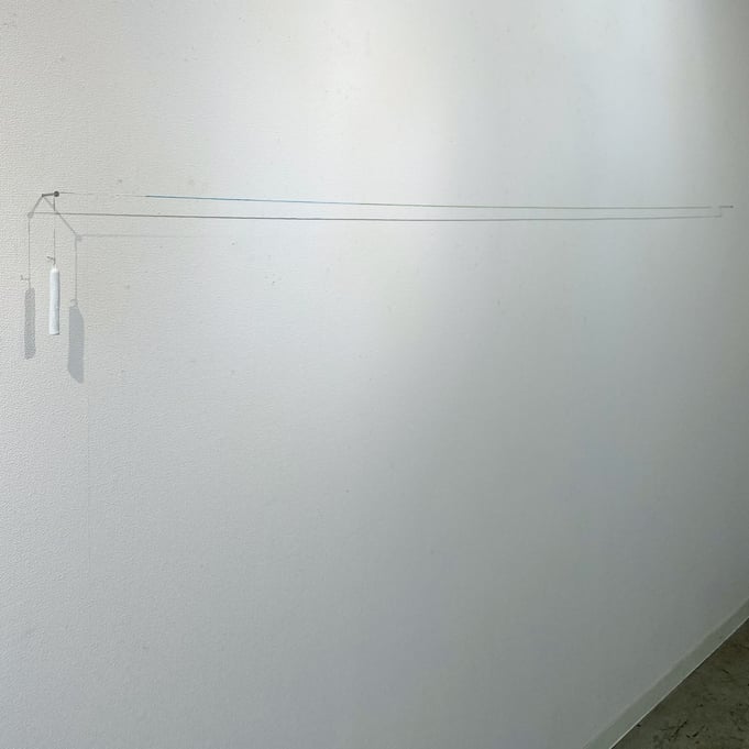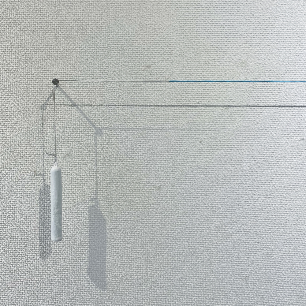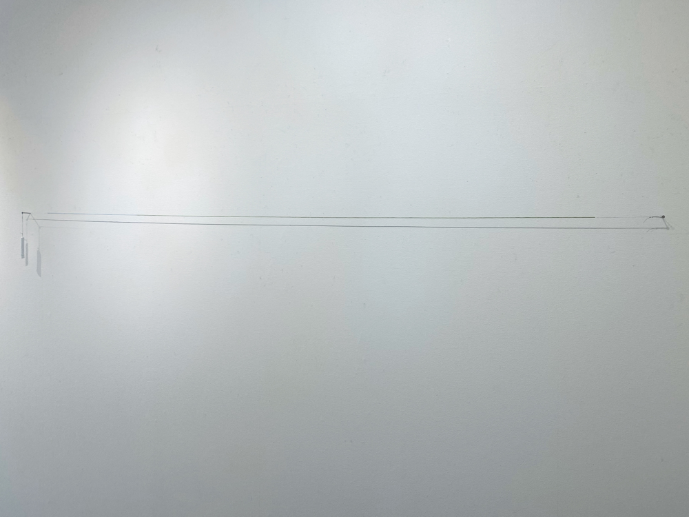 オモリ部分は作品ではなく展示するために必要な機能、とのこと。「線上の絵を壁につけて展示するときにいくつかの問題が起きました。それらを解決する方法がいくつか思いついて、そのうちのいくつかをやってみて、いくつかを展示しています。」のことでしょうか。