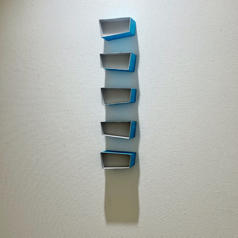こちらはドナルド・ジャッド? by 髙瀬きぼりお という感じでしょうか。工作用紙が用いられています。ドナルド・ジャッドはミニマリズムの代表作家と見做されることが多いですが、本人は否定しています。アメリカでミニマリズム・ムーブメントが起こった1960年代〜1970年代は、ベトナム戦争の泥沼化や人種差別の深刻化という社会問題があり、それまで主流となっていた抽象表現主義や、大量生産・大量消費を文脈に持つポップ・アートの登場とはまた別の、異なる価値観が求められていたのかもしれません。ジャッドは、色彩や形状において余分な要素を削ぎ落としただけでなく、作品に物語や象徴といったものが関連づくことも否定しました。