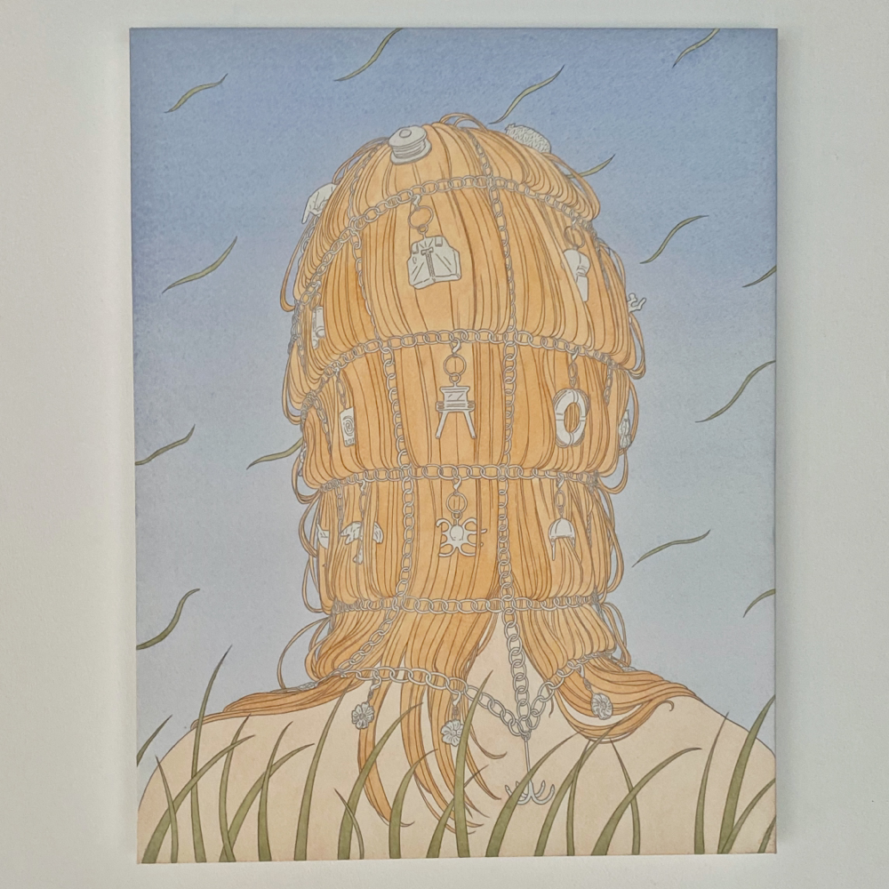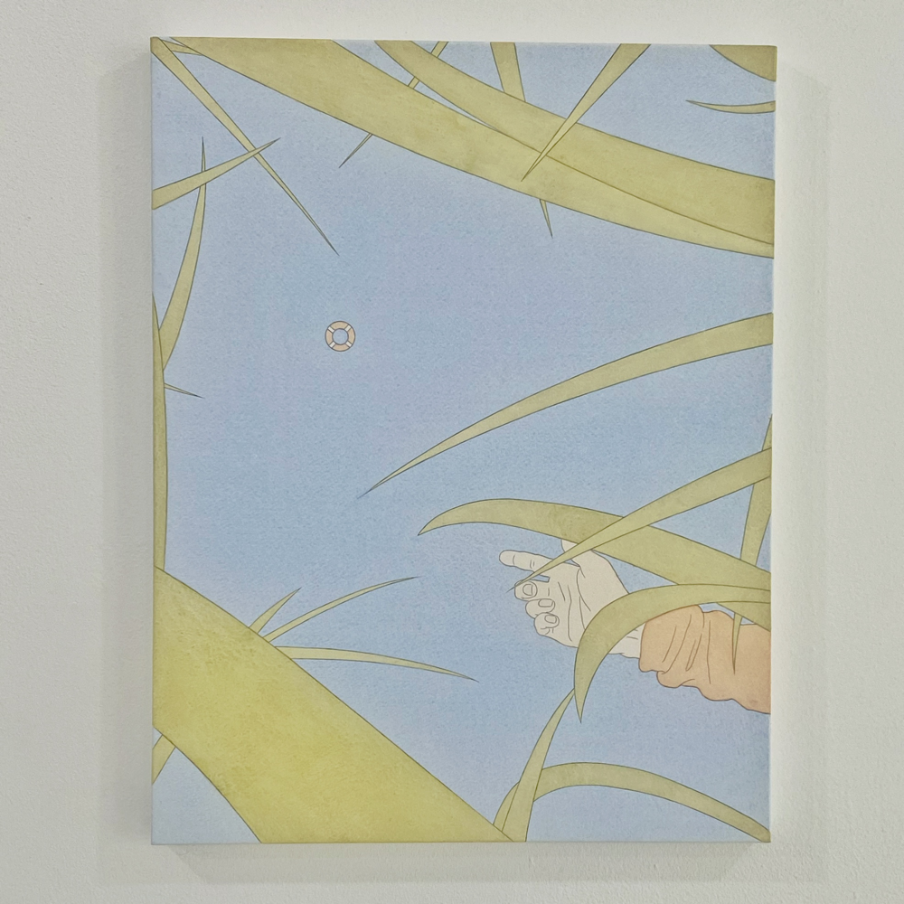 近年継続して取り組んでいる「LIFE, SAVE, AH~」シリーズは、八木が泥酔した際に見た幻の男性、「ライフセイバー」をめぐる物語です。「ライフセイバー」のことが忘れられず、一方でただ一度幻で見たそれはとても曖昧な像であったため、当初は幻の男性を繰り返し描きその輪郭を探ったり、妄想的に発展させた物語を制作していました。そのことを継続するうちに八木の興味は、幻の男性からそれに執着する自分自身へと移行していきます。つまり特定のイメージに執着、依存する人間像への関心です。その頃から「ライフセイバー」にアプローチする女性(八木の別人格という設定)を「スイムキャップ」と名づけ、このシリーズは「ライフセイバー」と「スイムキャップ」、二人の関係性をめぐる物語へと発展していきます。
