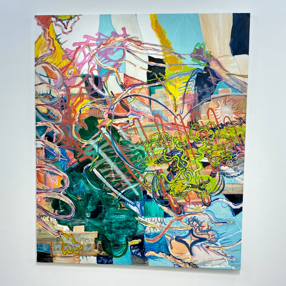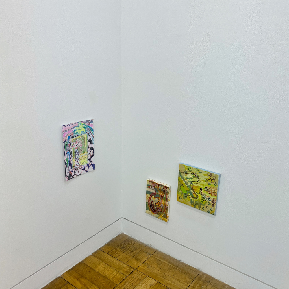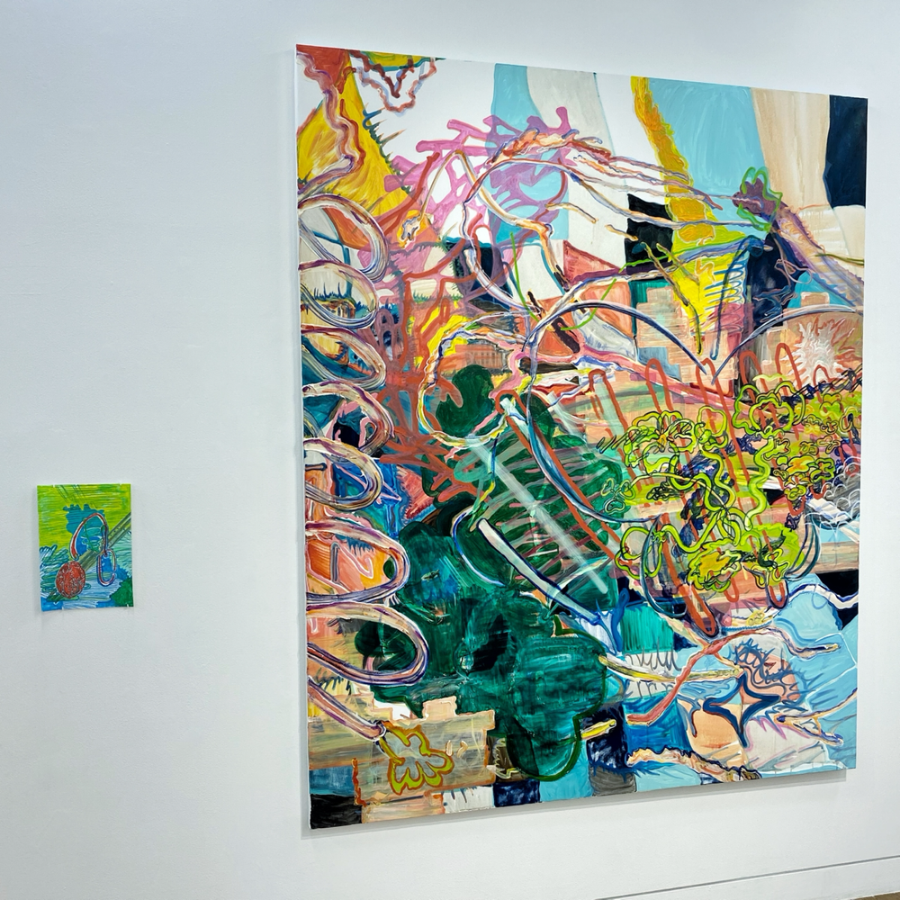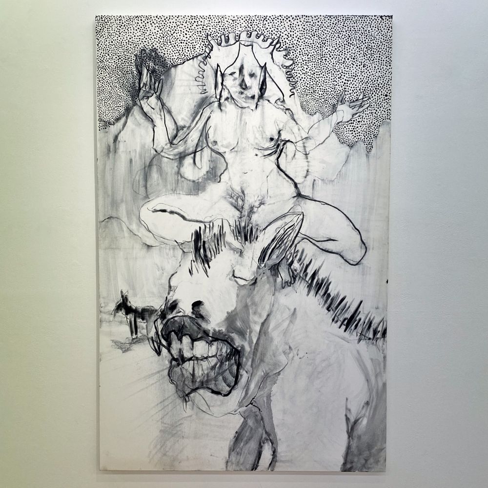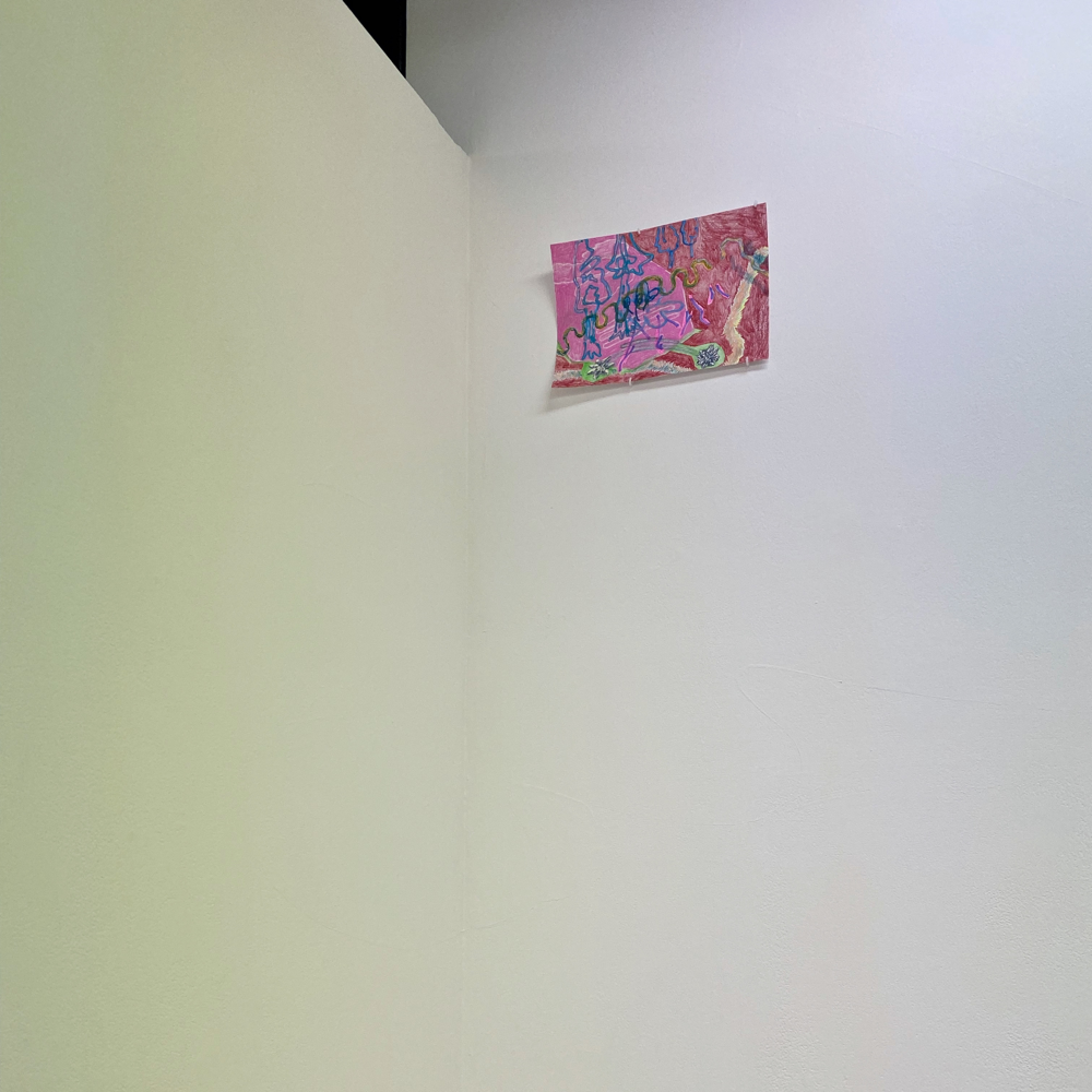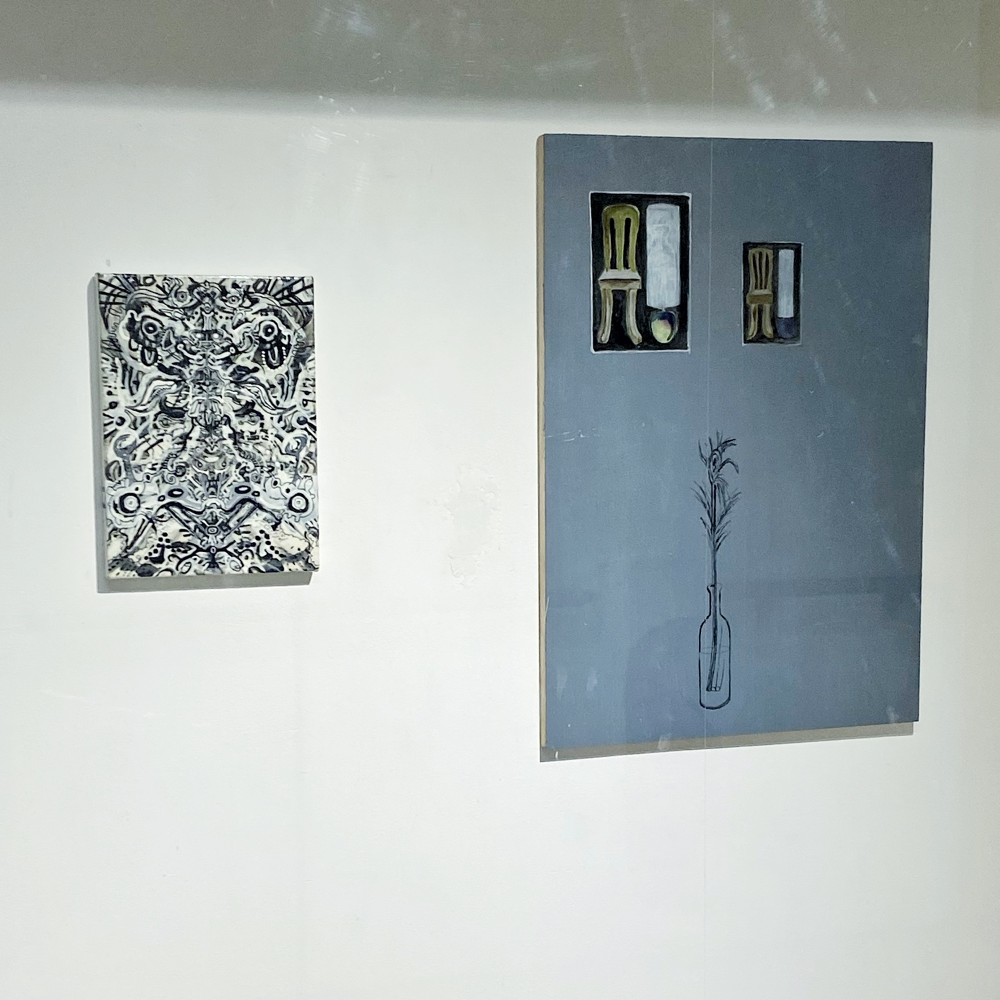 作品資料にはサイズ可変とあるので、これで一つの作品です。真ん中あたりに立つと、ここだけ異世界感があるというか。それはグループ展における各作家の作品の展示分けから感じるものだろう、と言われたらそうなのかも知れませんが、それも含めて展示方法としては成功しているのでは? とも思います。ここだけ、違う向きの風が吹く感じ。九里藍人さんの作品が、描かれた1つの対象に集中させる向きの風「>」だとしたら、伊藤夏実さんの作品は、個から世界へと向く「<」のベクトルを持っているような気がします。