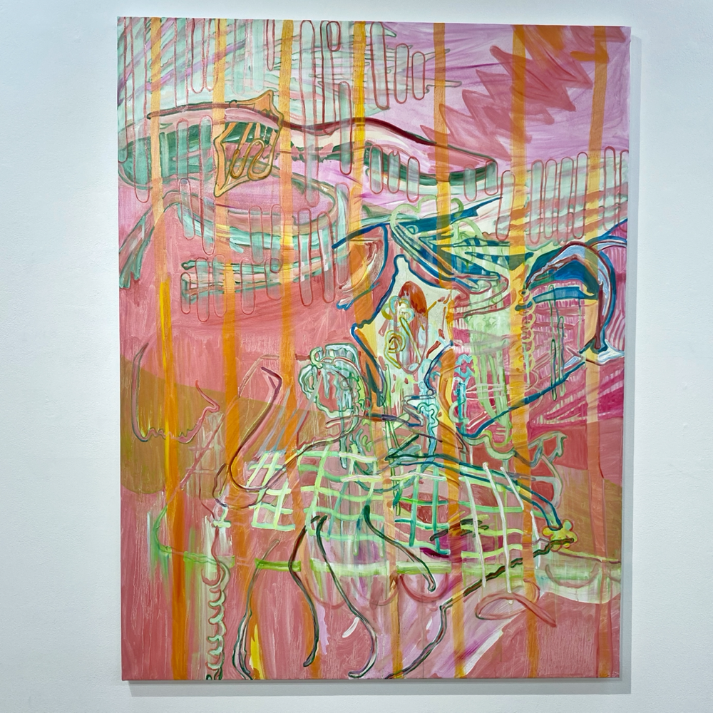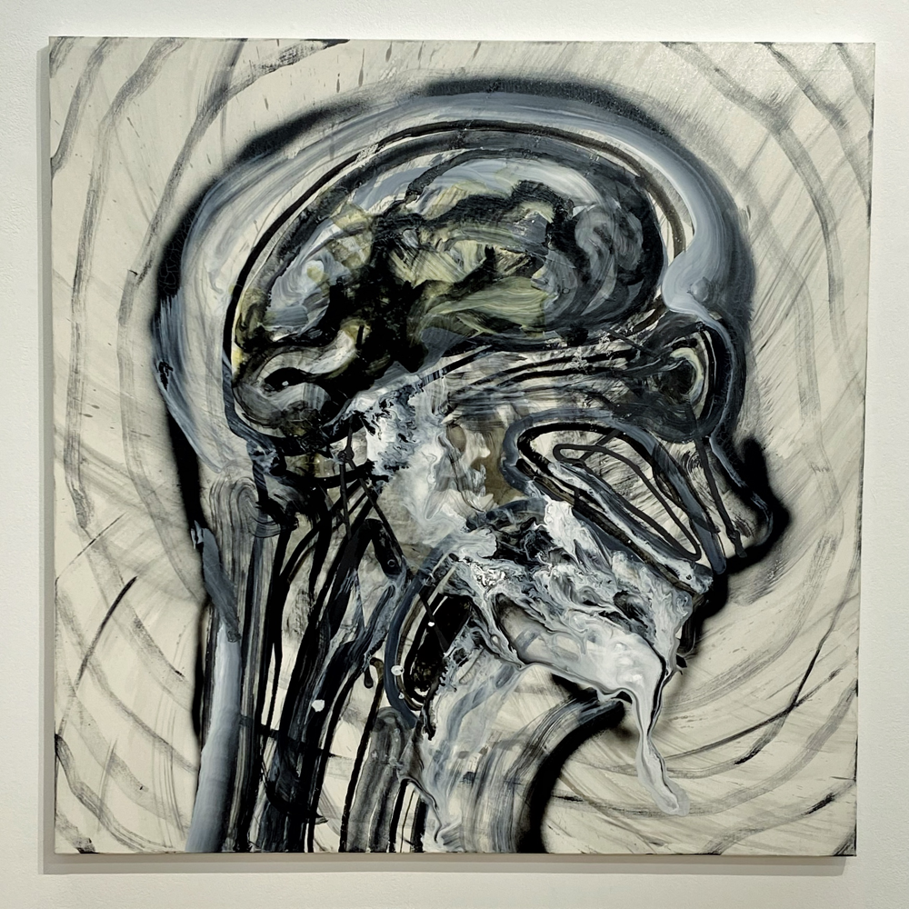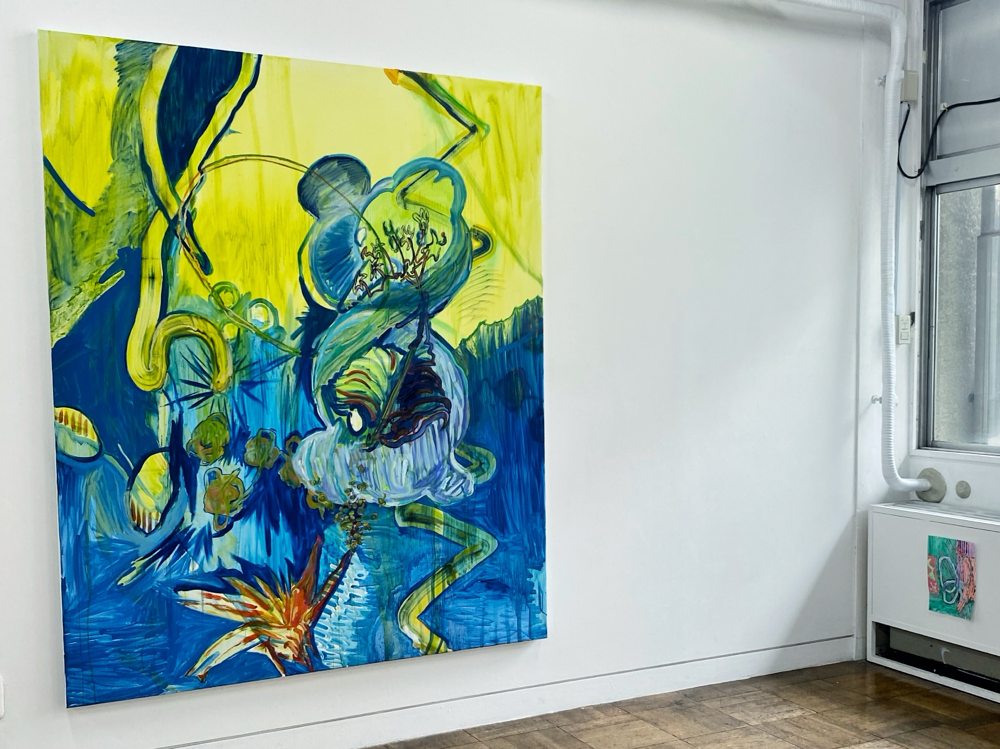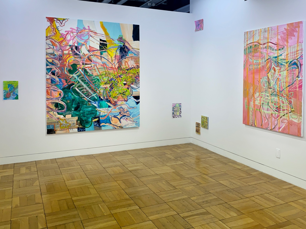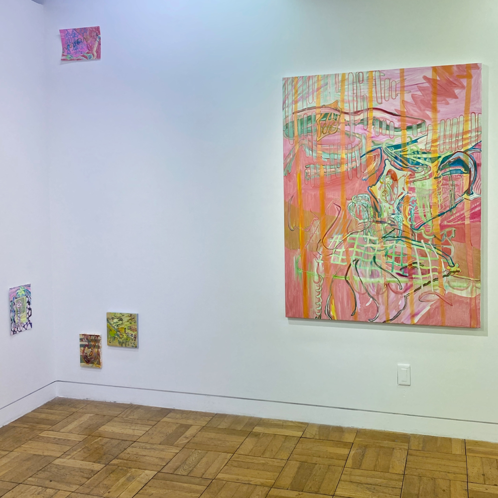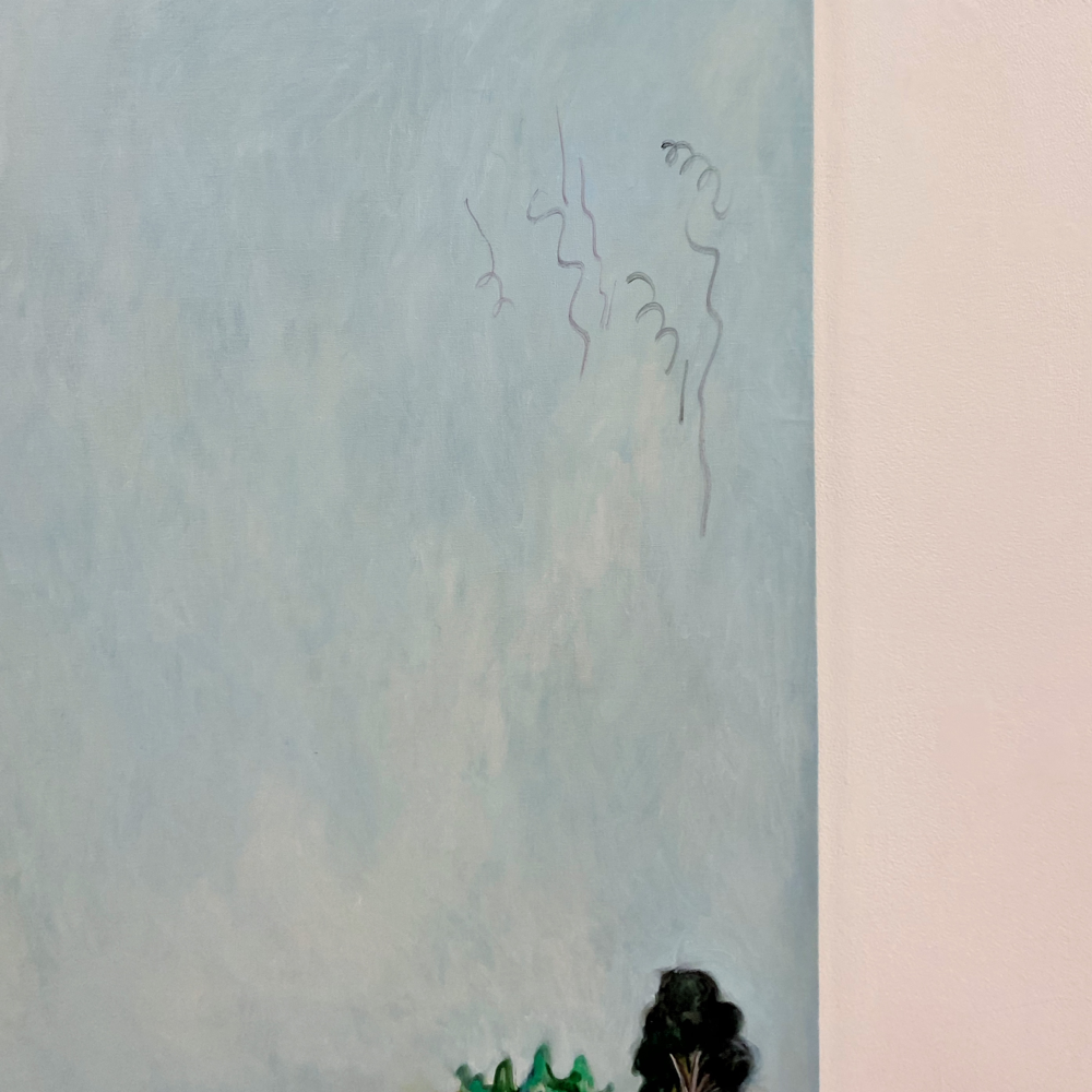 作品資料にはサイズ可変とあるので、これで一つの作品です。真ん中あたりに立つと、ここだけ異世界感があるというか。それはグループ展における各作家の作品の展示分けから感じるものだろう、と言われたらそうなのかも知れませんが、それも含めて展示方法としては成功しているのでは? とも思います。ここだけ、違う向きの風が吹く感じ。九里藍人さんの作品が、描かれた1つの対象に集中させる向きの風「>」だとしたら、伊藤夏実さんの作品は、個から世界へと向く「<」のベクトルを持っているような気がします。