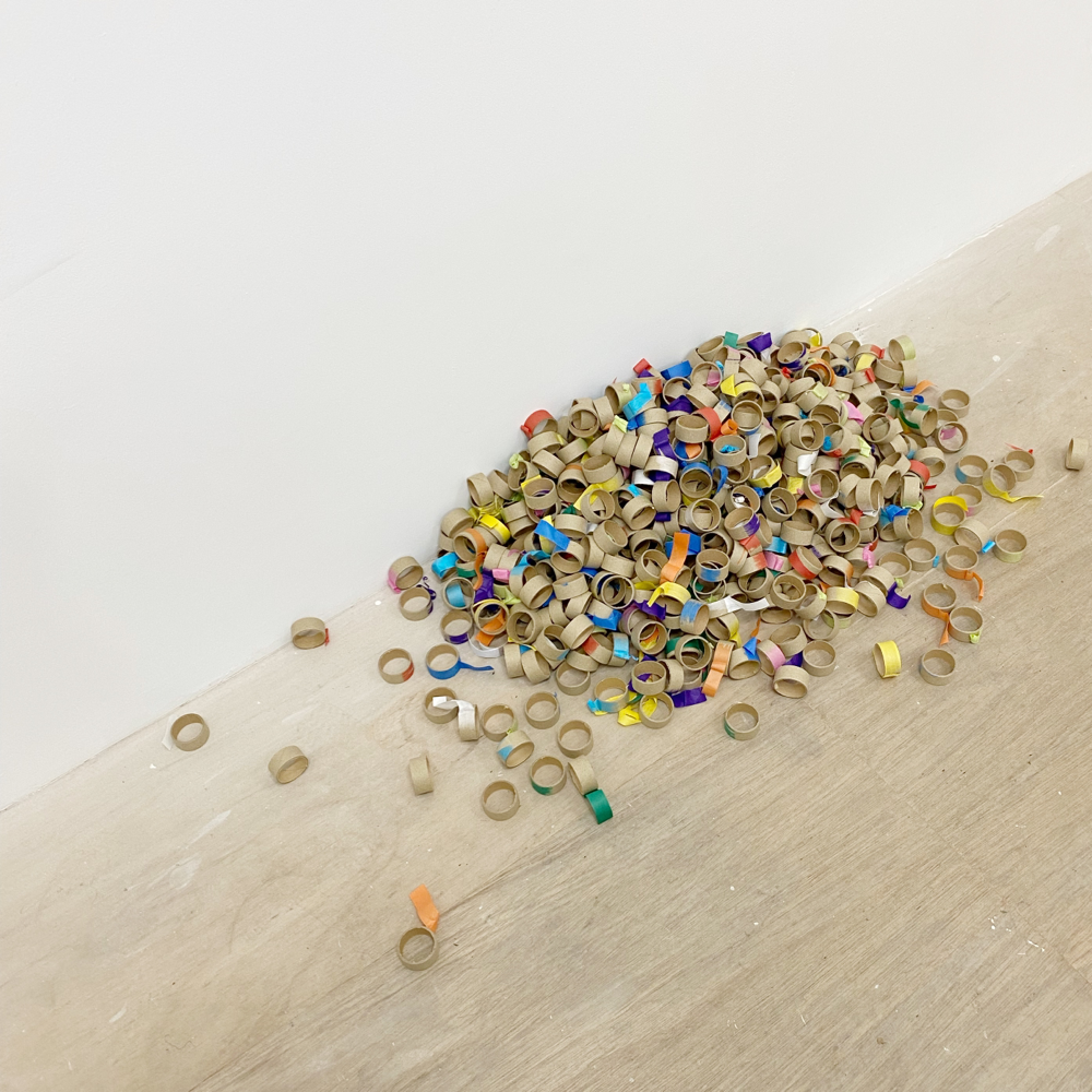 そして、ロフト部分の「to turn back」で使用した紙テープの芯が、まとめて会場に置かれているのも興味深いです。表現と言うより、事実として置かれています。