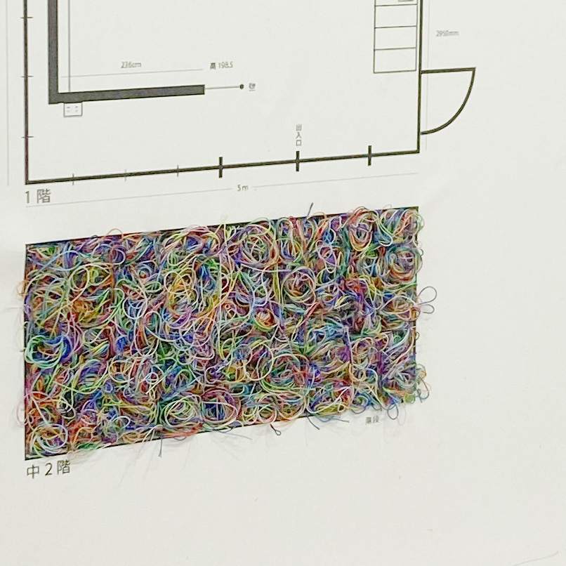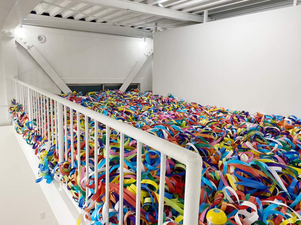このロフト部分の面積にちょうど敷き詰められた「to turn back」の紙テープは「It’s growing up」と同じ600本です。会場の面積が違えばこのような見え方にはなり得ないことを考えると、こちらも偶発性があると言えそうです。実際、前述のアーカイブファイルにある別の会場での「to turn back」で使用した本数は違います。