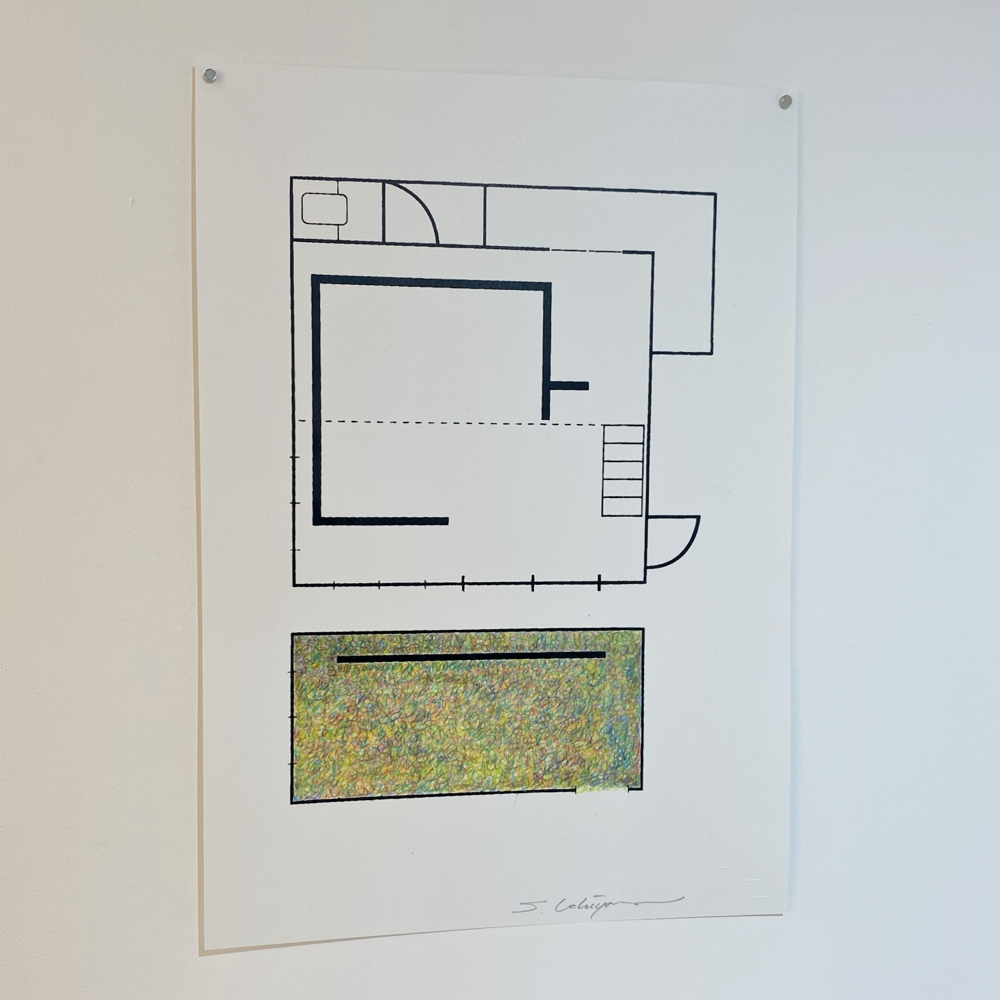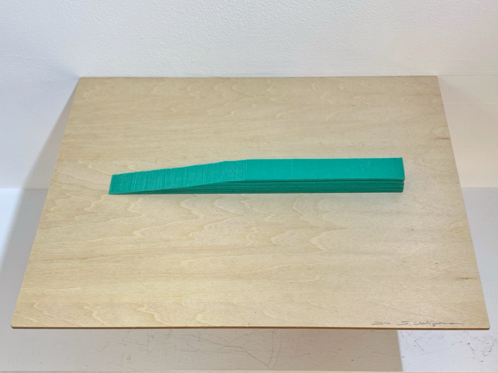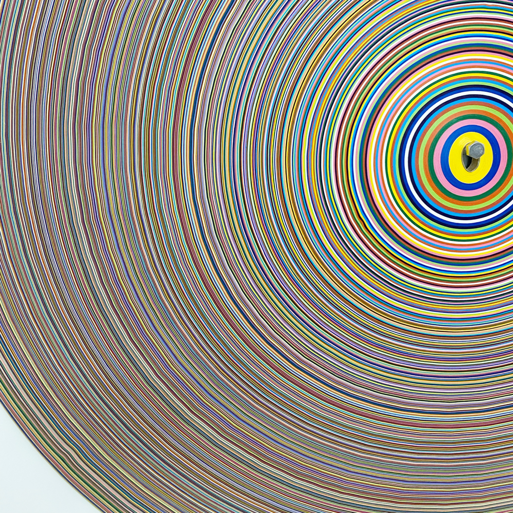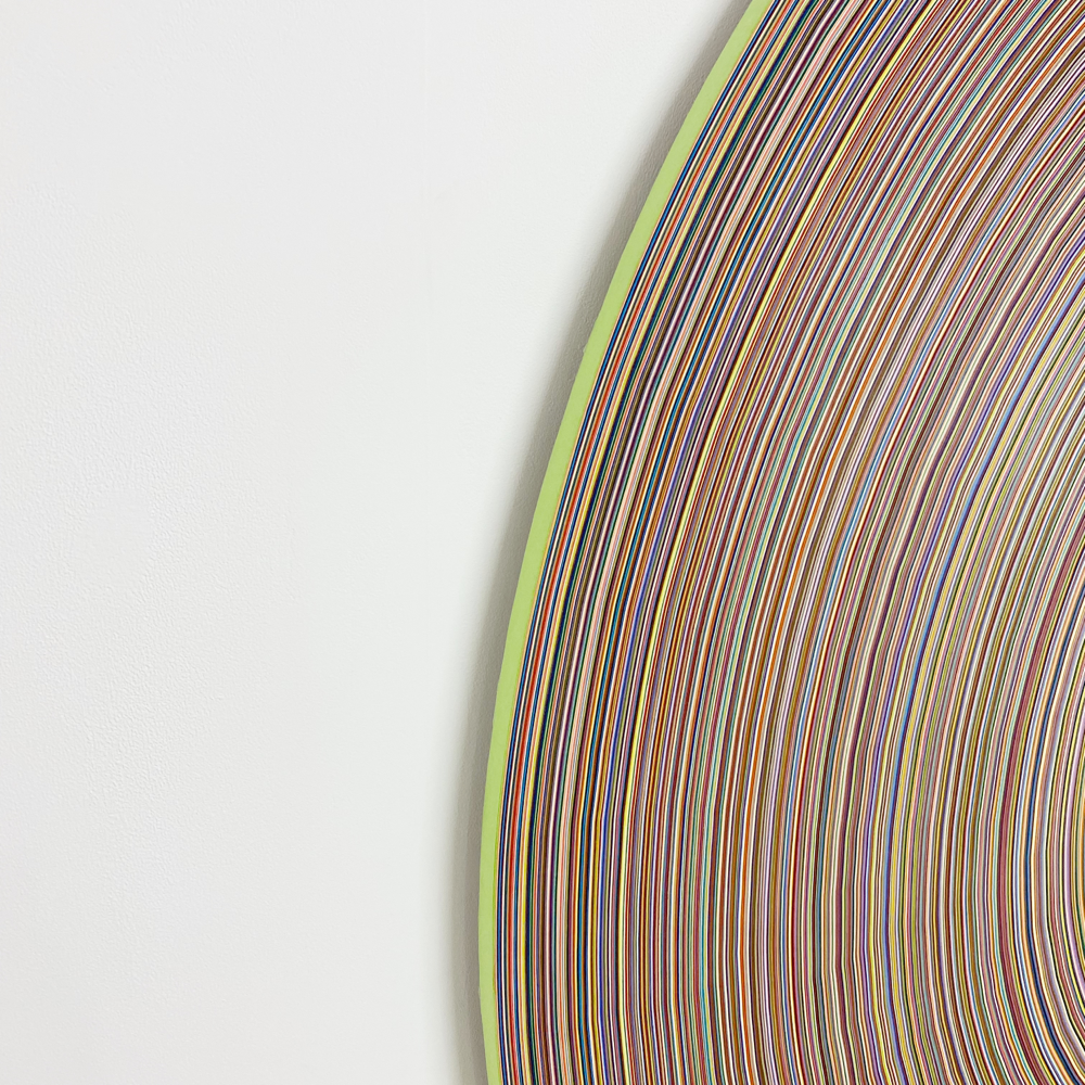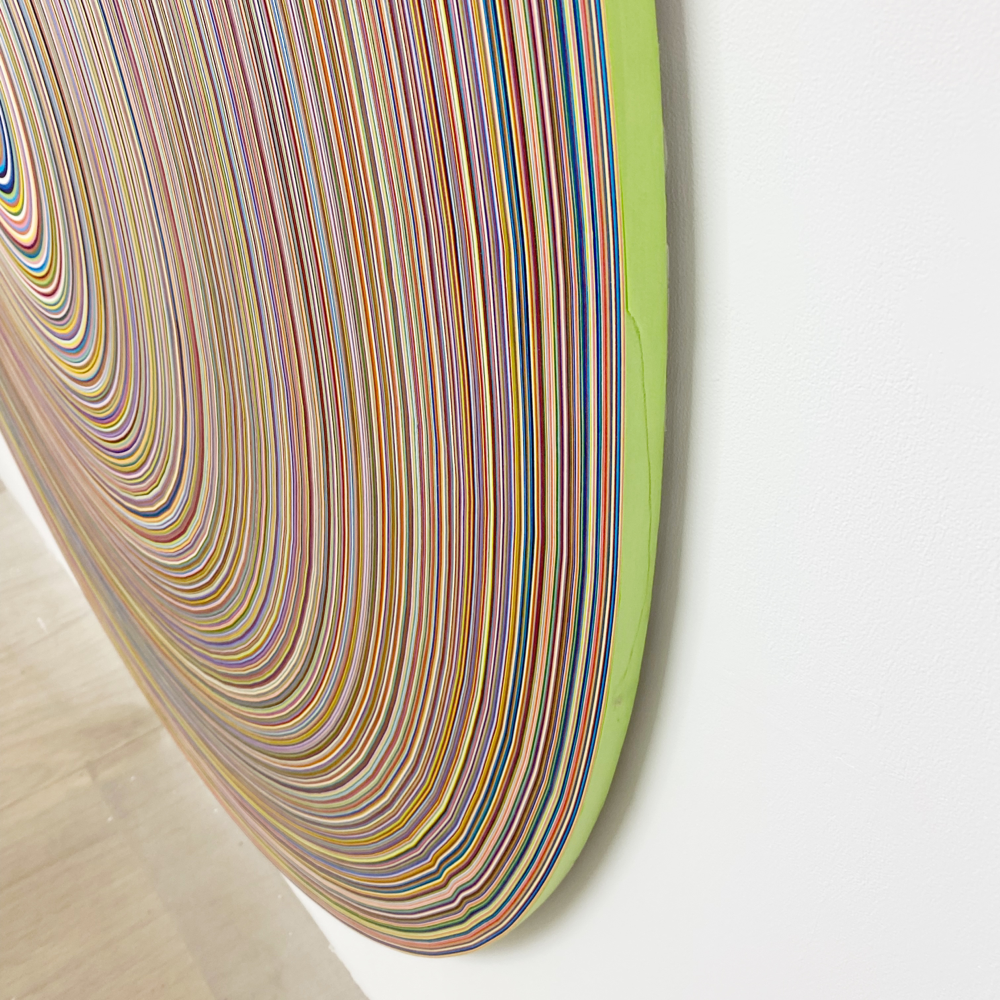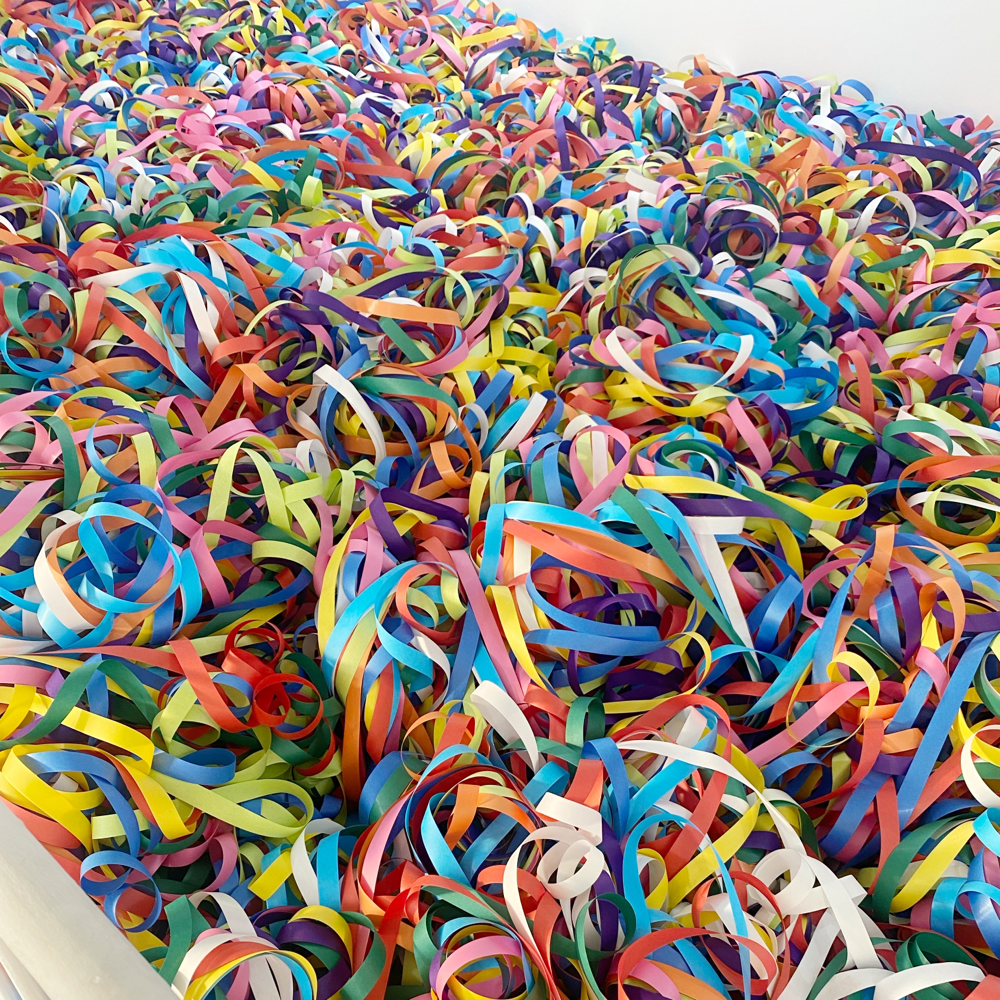 この「to turn back」は、紙テープを10色各1本ずつ、順番は人の手によるランダムな選出により取り出し、それをイーゼルに引っ掛けて一気に引き出すという方法で制作されています。亀戸アートセンターさんのインスタグラム (0:37〜) で制作時の早回し映像を観ることが出来ます。