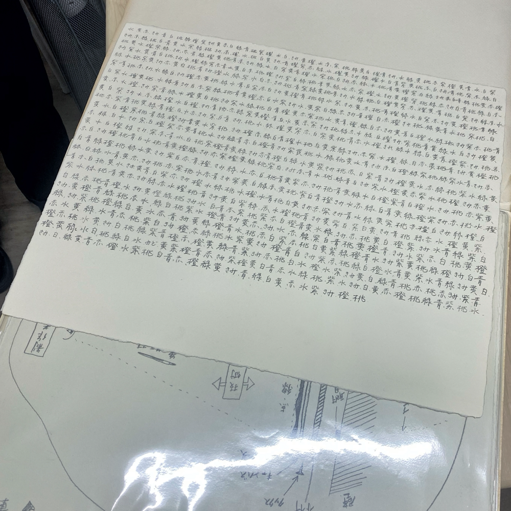 内山さんご本人が在廊されていたこともあり、以前の「It’s growing up」制作の際の色順を見せていただきました。会期初日に行われたアーティストトークでも、この色順の記録が出てきた際には会場にどよめきが起こったようです。漢字の意外さと、内山さんの研究者的側面への感嘆のようにも思います。