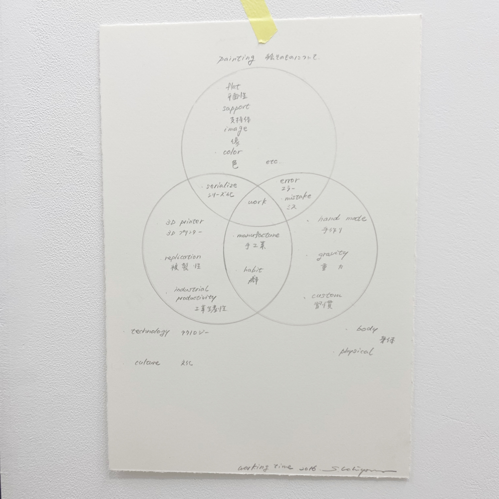 「work」を構成する要素の関係を「painting」「technology」「body」の重なりとして示したドローイング。