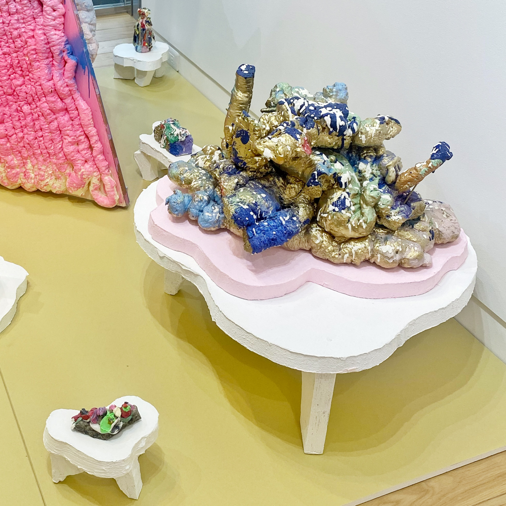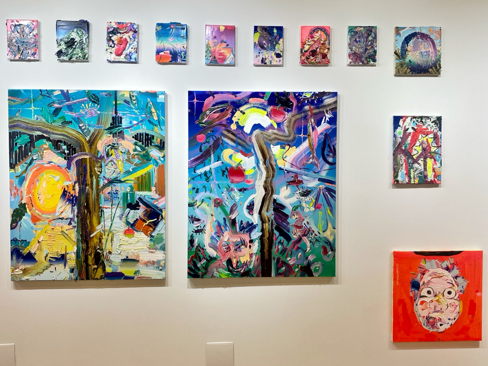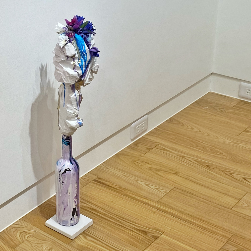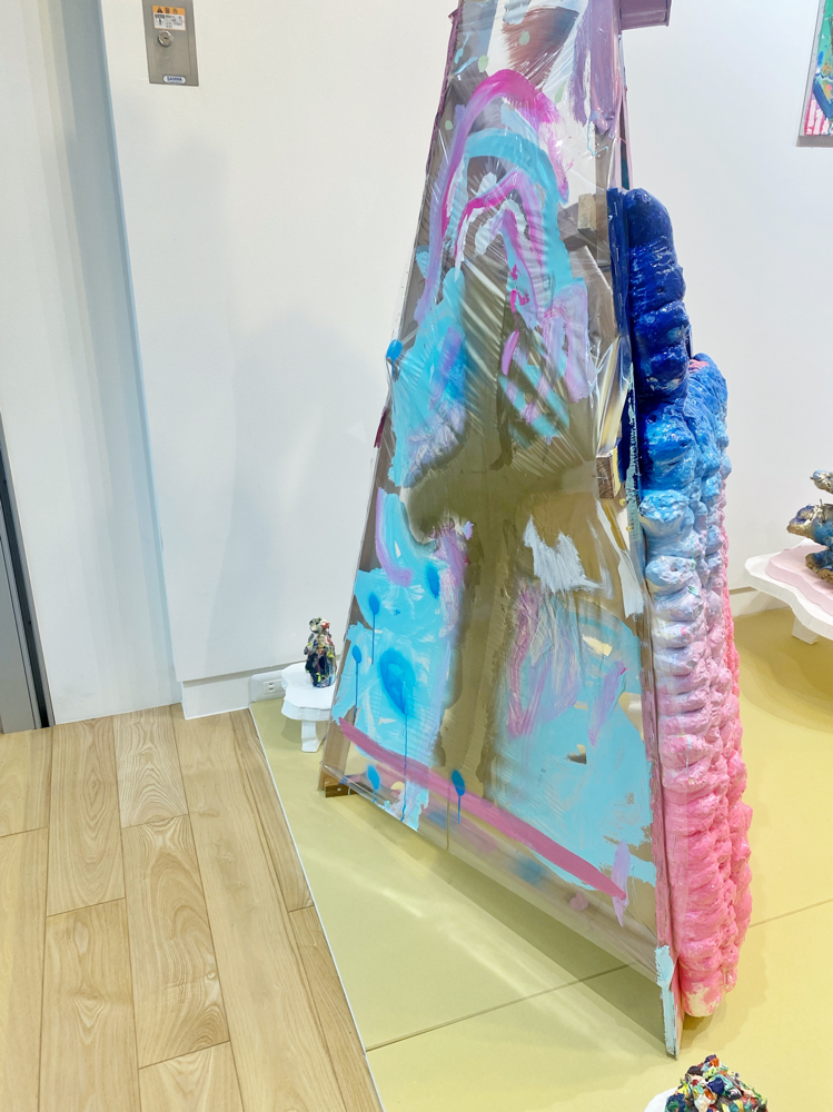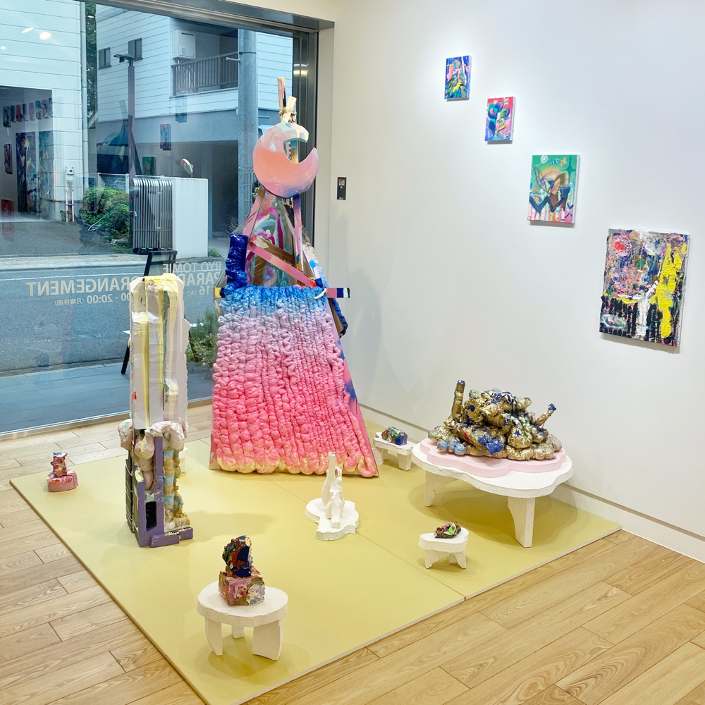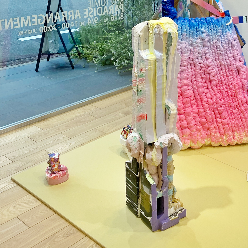 RYO TOMIEさんは1991年生まれ、多摩美術大学大学院絵画専攻油画研究領域終了。幼少期をフランスと日本で過ごすという経験から「越境」をテーマに、自身のアイデンティティのねじれそのものをスタイル化する作品を制作しています。西洋のフランスから見たアジアの日本、日本から見た西洋、その両方からの視点を経験すると、どんな世界が見えてくるのでしょうか。また「越境」には、西洋とアジアの境だけでなく、個人的なものと普遍的なものの境を越える、という試みも含まれています。本展「PARADISE ARRANGEMENT」は、アレンジメントという言葉にも表れているように、フラワーアレンジメント ≒ 活け花というキーワードがあり、当初は花をモチーフとして持ち込むことが想定されていたそうですが、絵の具を置く行為、立体を配する行為、その他TOMIEさんが制作する行為の中に「活ける」という行為そのものが見出され、その「活ける行為」を通して個人の経験から普遍的なものへの「越境」を試みた展示となっています。