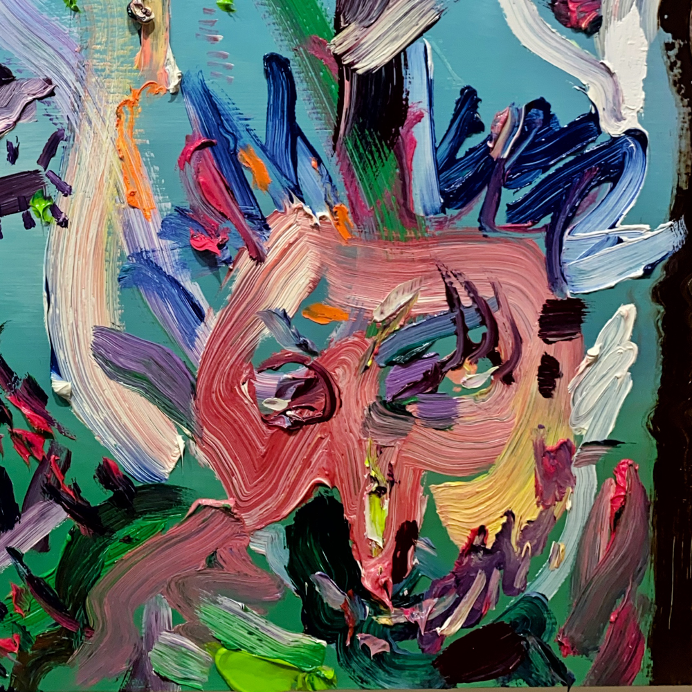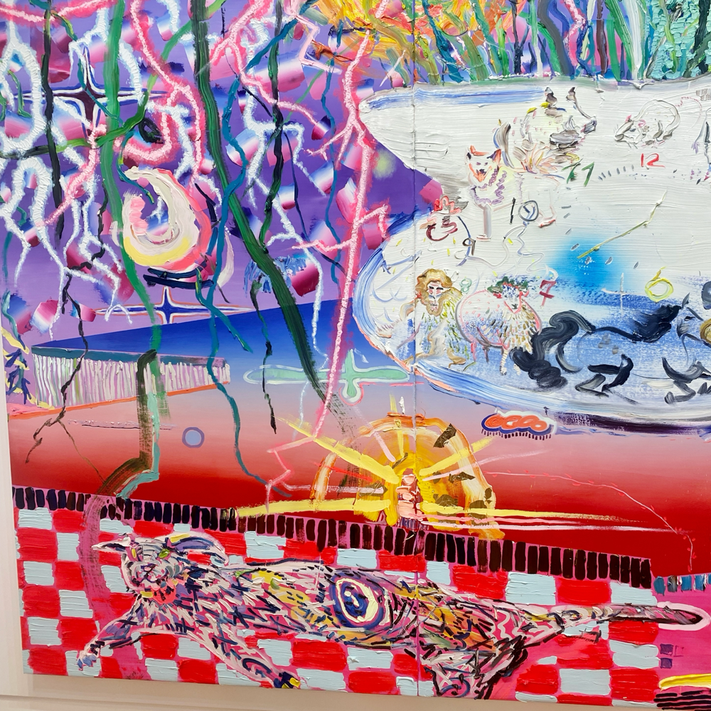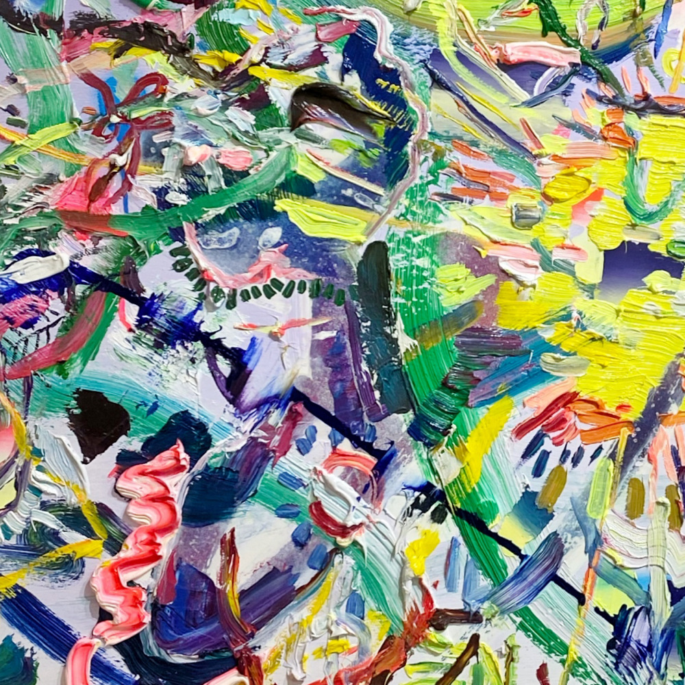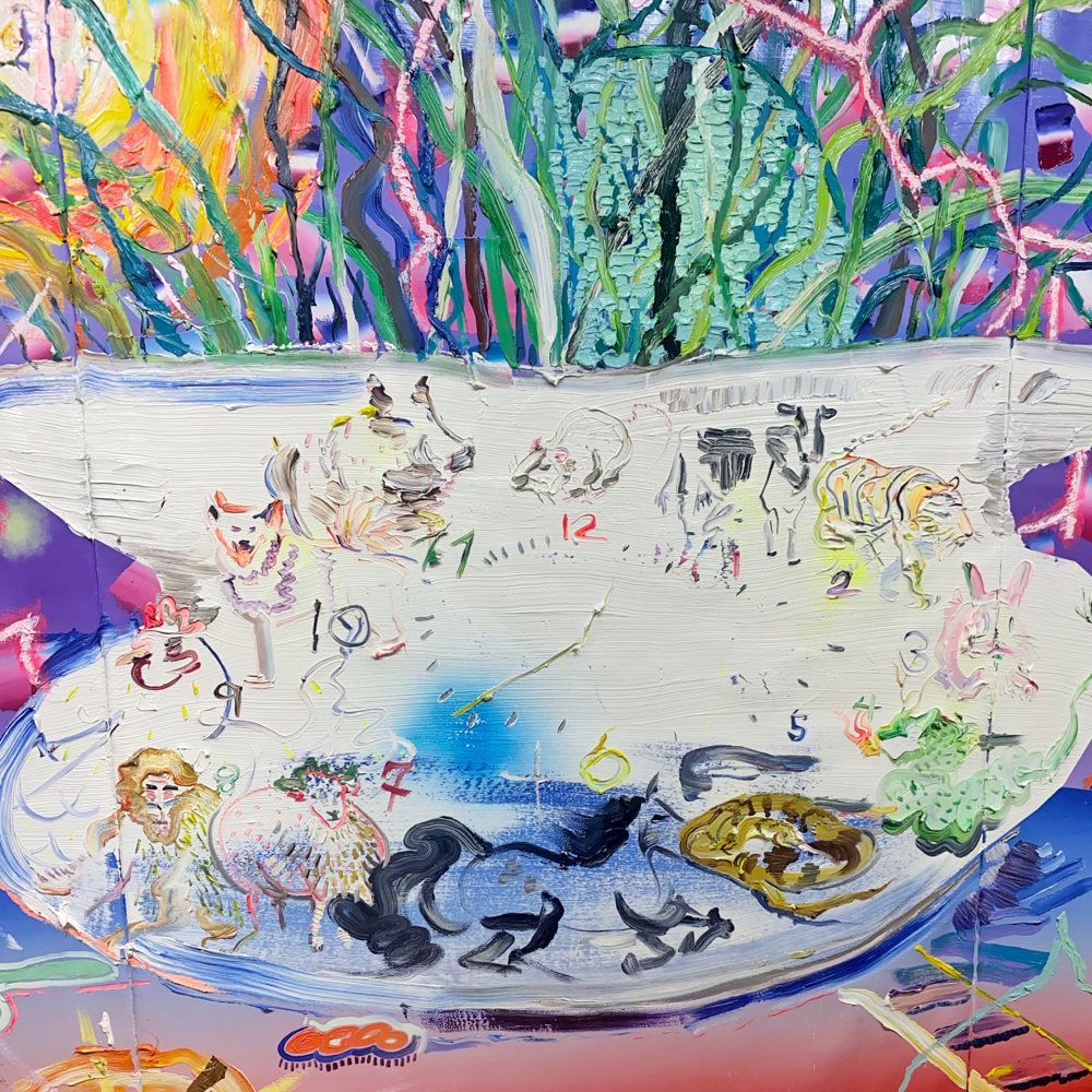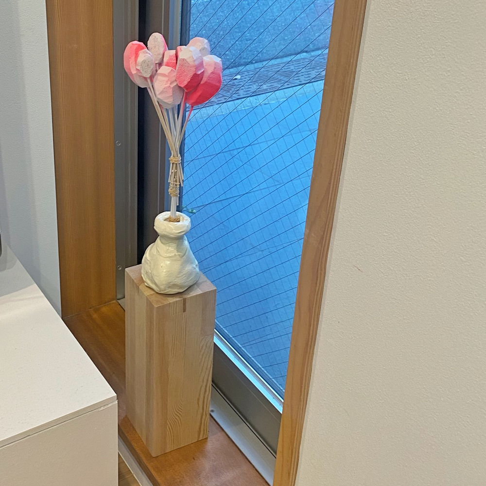 RYO TOMIEさんは1991年生まれ、多摩美術大学大学院絵画専攻油画研究領域終了。幼少期をフランスと日本で過ごすという経験から「越境」をテーマに、自身のアイデンティティのねじれそのものをスタイル化する作品を制作しています。西洋のフランスから見たアジアの日本、日本から見た西洋、その両方からの視点を経験すると、どんな世界が見えてくるのでしょうか。また「越境」には、西洋とアジアの境だけでなく、個人的なものと普遍的なものの境を越える、という試みも含まれています。本展「PARADISE ARRANGEMENT」は、アレンジメントという言葉にも表れているように、フラワーアレンジメント ≒ 活け花というキーワードがあり、当初は花をモチーフとして持ち込むことが想定されていたそうですが、絵の具を置く行為、立体を配する行為、その他TOMIEさんが制作する行為の中に「活ける」という行為そのものが見出され、その「活ける行為」を通して個人の経験から普遍的なものへの「越境」を試みた展示となっています。
