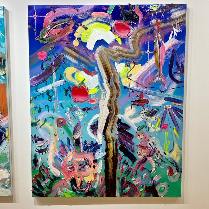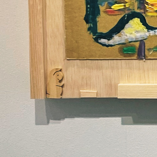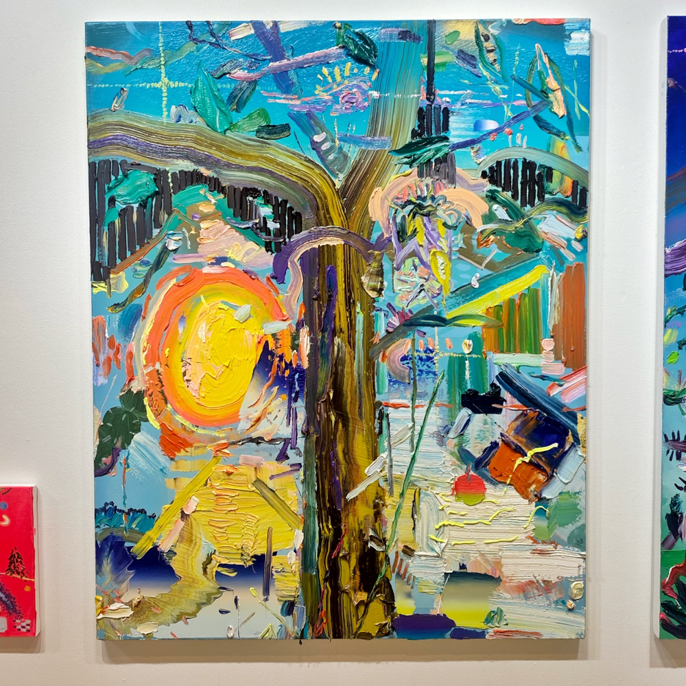 鮮やかな色彩と勢い、一見して脈絡のない、夢でも見ているかのような画面構成の中に、自然と神秘的な意味を探ろうとしてしまいます、、、。目はエジプト神話のホルスの目、とか、魚はキリストの隠れシンボルとか。それらのシンボルが木に接しているので、人間が潜在的に持っている普遍的なイメージが分岐して枝分かれしていった様子を表しているようにも思える。元々一つの楽園にあったものが散り散りになった、追放された、とも読めそうです。