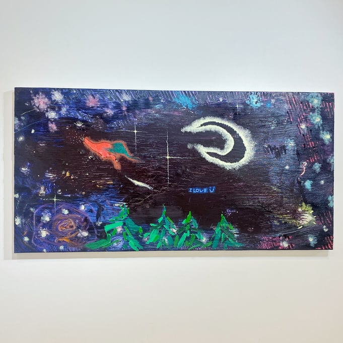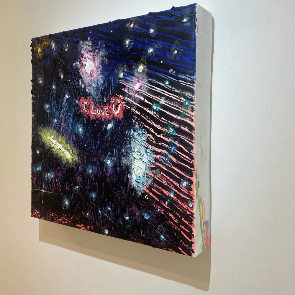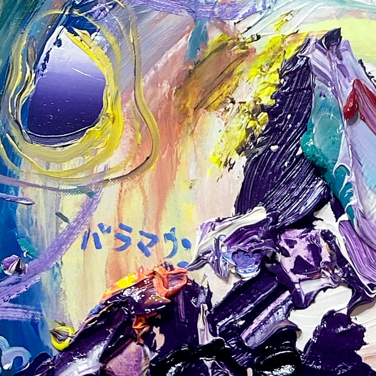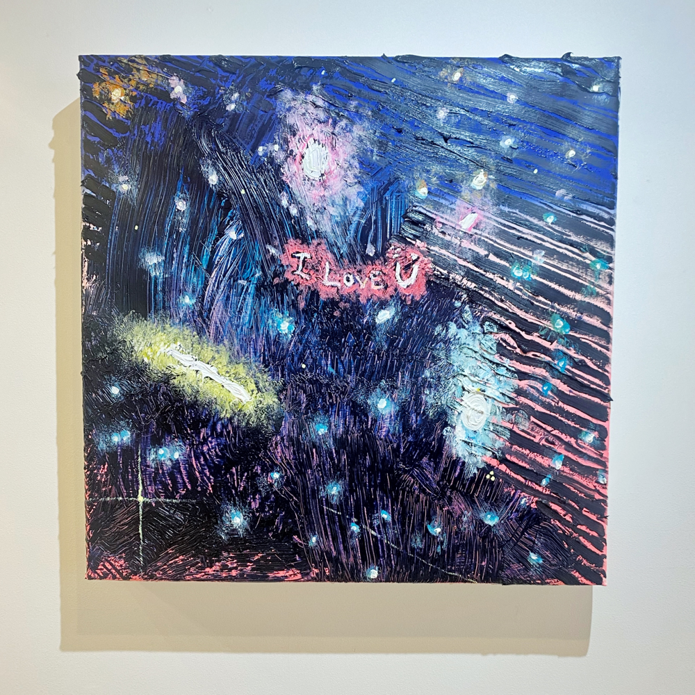 こちらの作品は一転して静かな夜空です。「LEO TRIPLET」とは「しし座の三つ子銀河」のことを言うそうです。しし座に3つも銀河があるとは知りませんでした。作品タイトルの数字は日付を表していて、こちらの「LEO TRIPLET 071022」は2022年7月10日完成という意味なので、展示作品の中では比較的新しい作品になります。