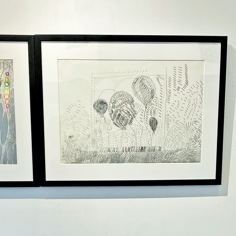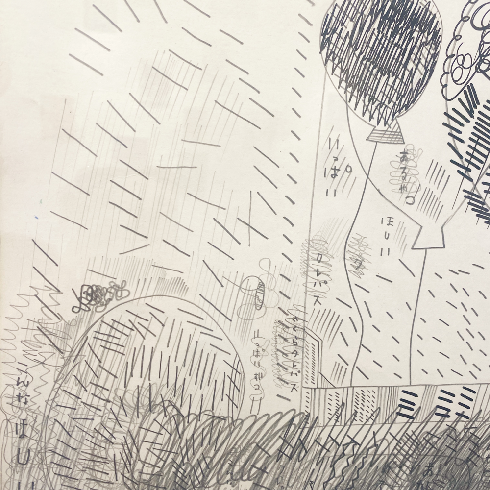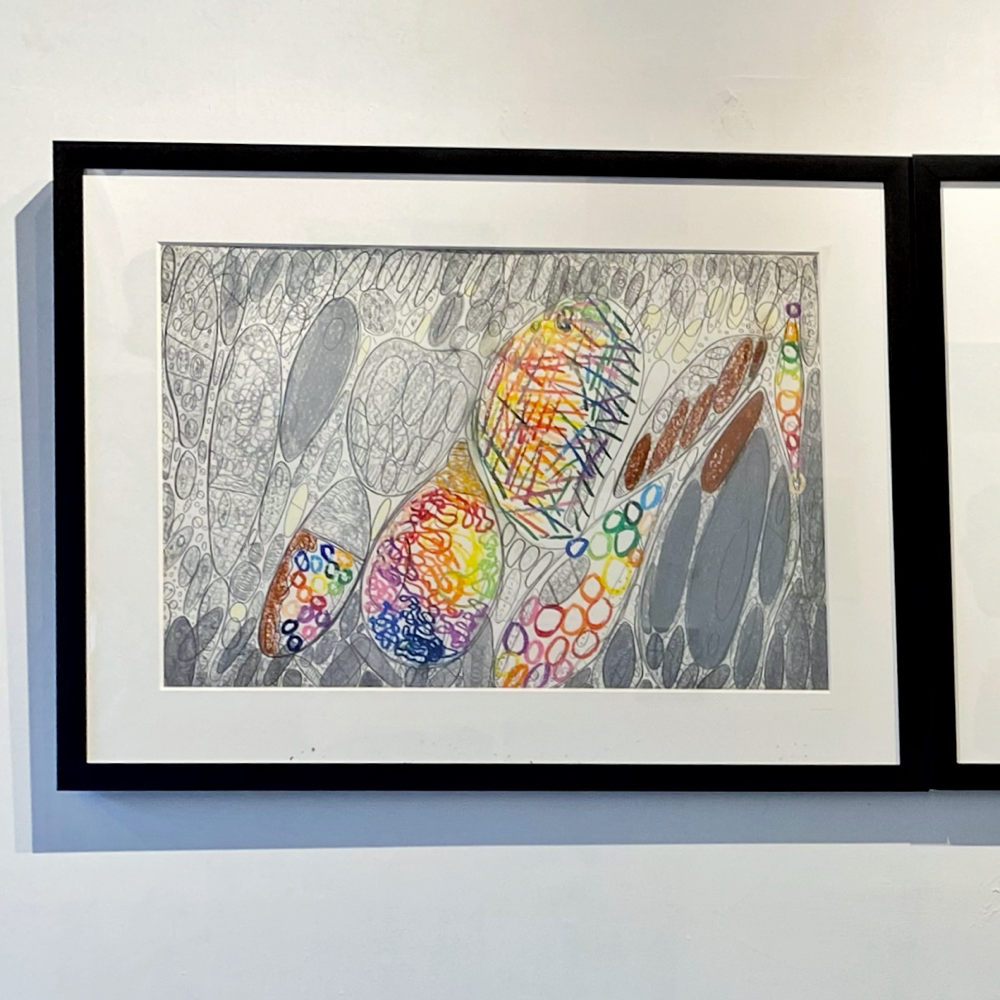 chappyさんの作品のキーワードとしてもう一つ「線」があります。無数の線の重なりを、私たちは時に「面」と認識したり、線を消した跡も「線」と感じたり。本展では前述の「BIG OIL PASTEL」による「重厚さ」を感じる作品が多かったのですが、その「重さ」の対極にある「軽さ」を感じさせる作品もありました。