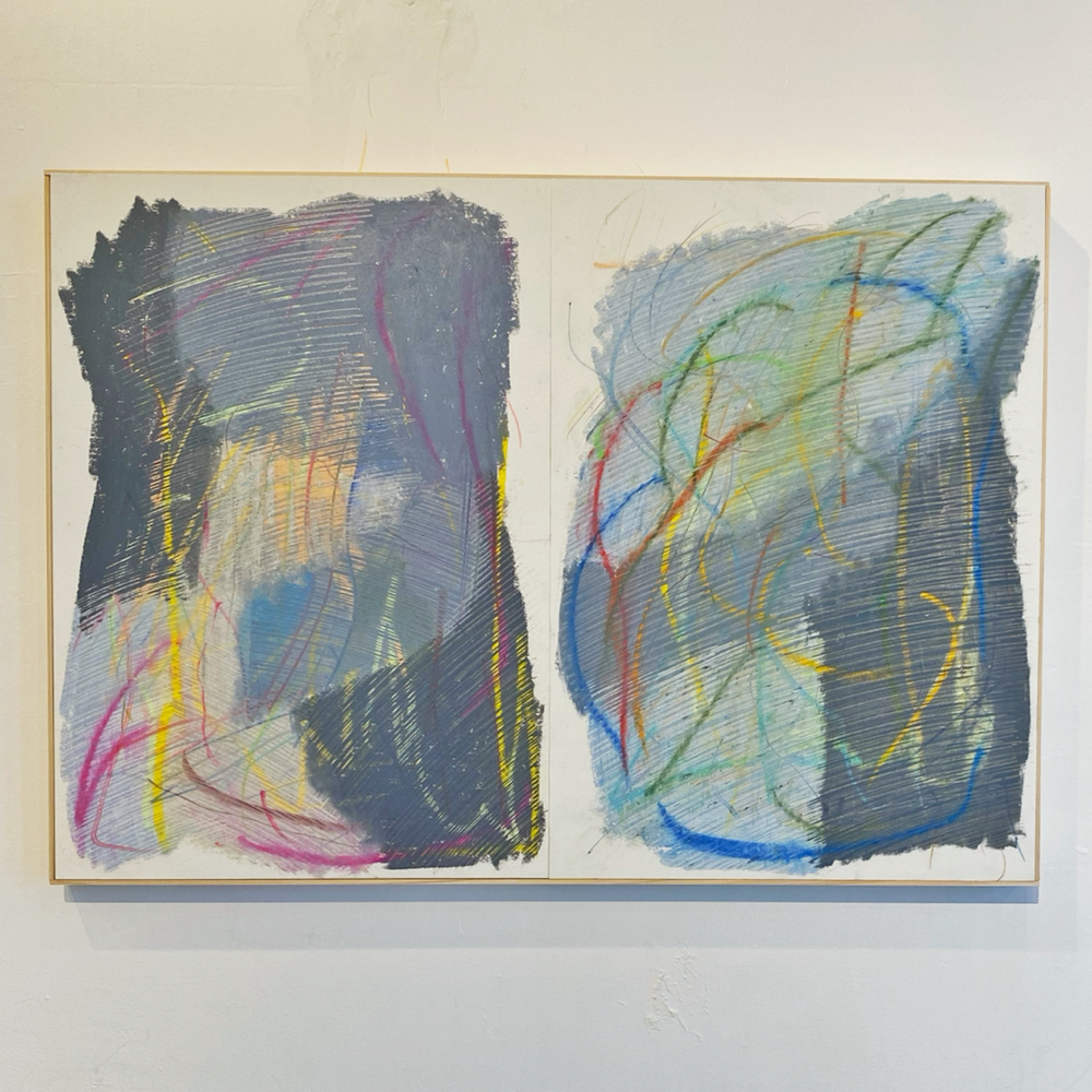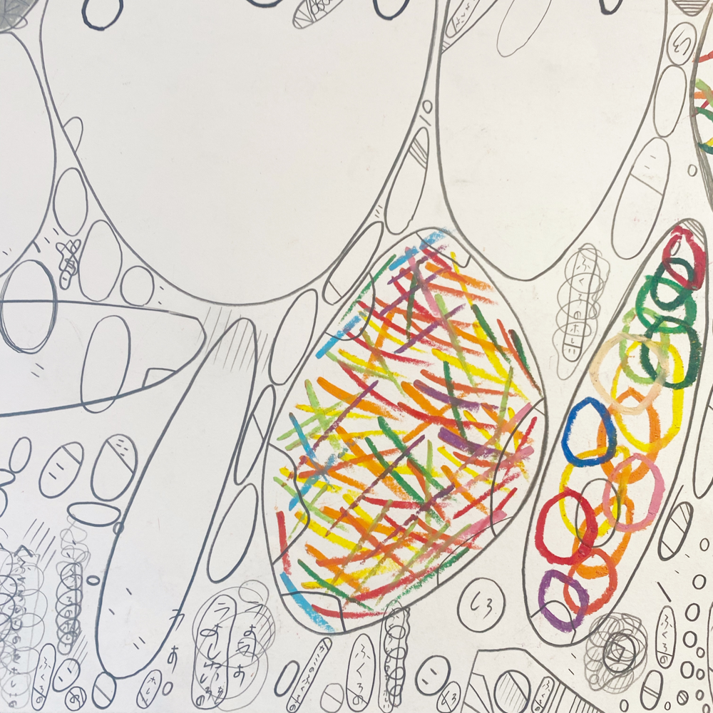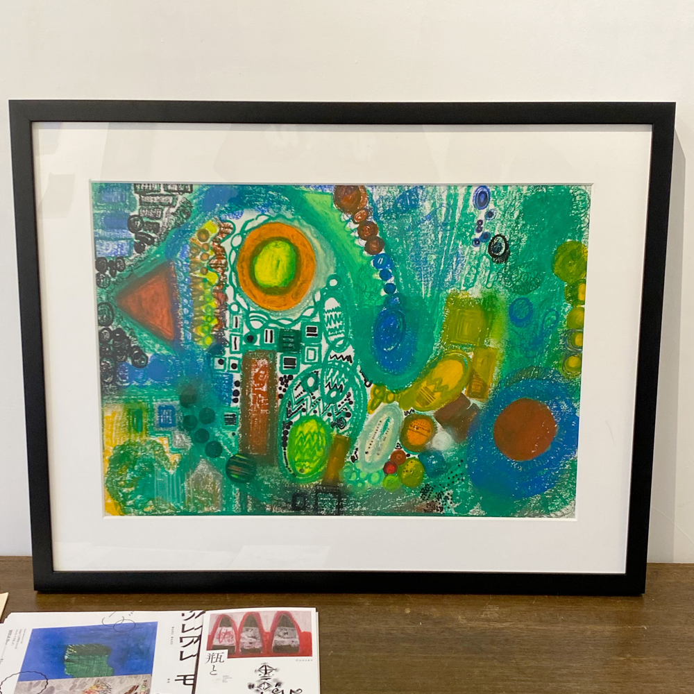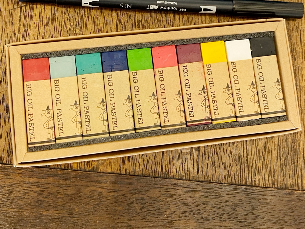 これには使用画材の変化も関係しているそうです。本展では、河内洋画材料店さんの「BIG OIL PASTEL」を使用して制作された作品も多い、とのこと。「BIG OIL PASTEL」は退色の少ない上質な顔料を多く使用し、かつ、なめらかな描き味を実現する為に可能な限りオイルの含有量を高めたオイルパステルです。実際の作品を観ると「厚み」をとても感じます。