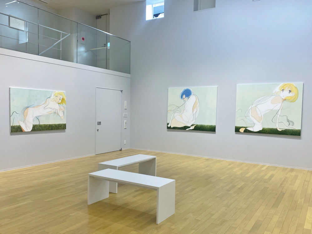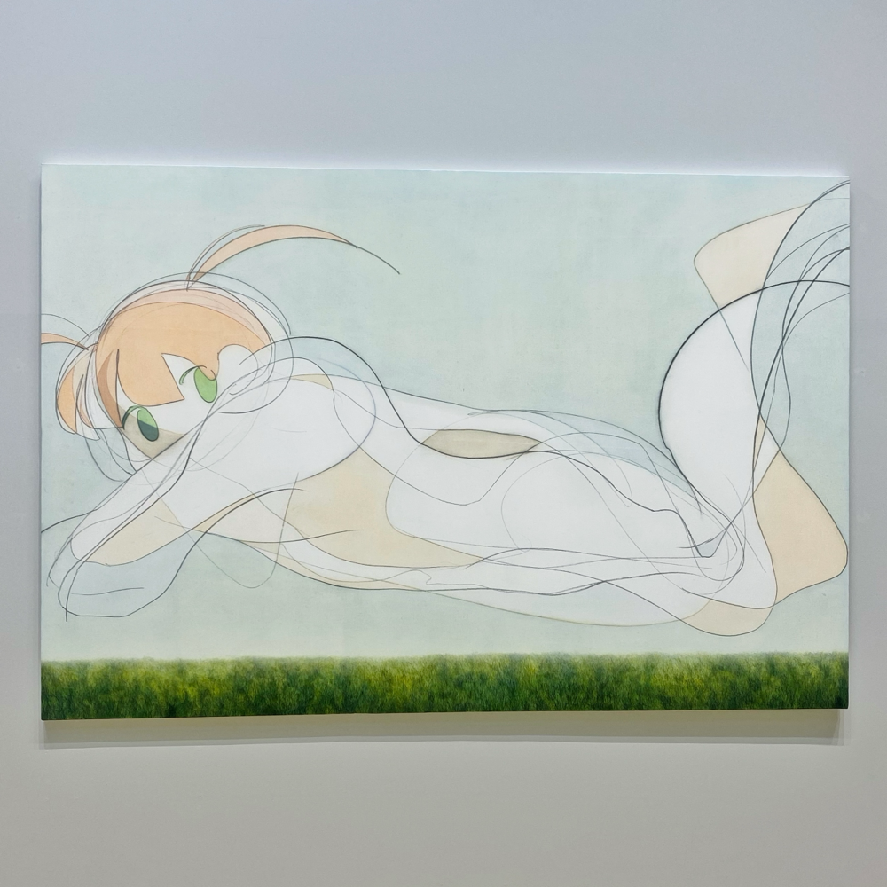 この「解体」という言葉をもうちょっと詳細に掘り下げたいのですが、例えば残像が残っているような線の表現から、マルセル・デュシャンの「階段を降りる裸婦像No.2」のような連続した動作を解体しているのかというと、ちょっと違う印象を受けます。別の作家さんの例を挙げさせていただきますが、LIGHT HOUSE GALLERYで2021年2月に開催された内田ユイさんの個展「CEL DIVISION」にはデュシャンを連想させるタイトルがついている作品があって、もっと密に連続したイメージが連なっています。安齋さんの作品はそういう意図ではないように受け取りました。動きの要素自体は微かに残っている感じ。決まった動きを見せることが一番の目的ではなく、その動きすらも鑑賞者が「自由」に補完できる余白を残しているように思います。アニメ的キャラクター表現が現代美術の中に存在してから産まれた世代「キャラクター絵画ネイティブ世代」(私の造語です) である同世代作家の川獺さんのコメントの「解体」は、作り手である安齋さん自身の身体の動きの解体、そして絵画自体の構成の解体を意味しているのではないでしょうか。自身の感覚で「描く」「描かない」「消す」「消さない」「塗る」「塗らない」という動作を探りながら描かれているように感じました。そこに「自由」が宿り、観る者に無重力の軽やかさを感じさせるのかもしれません。