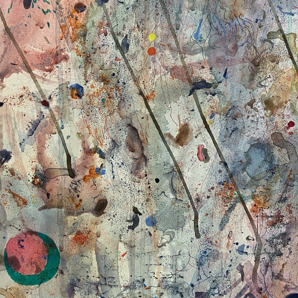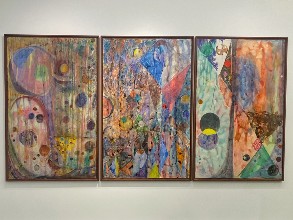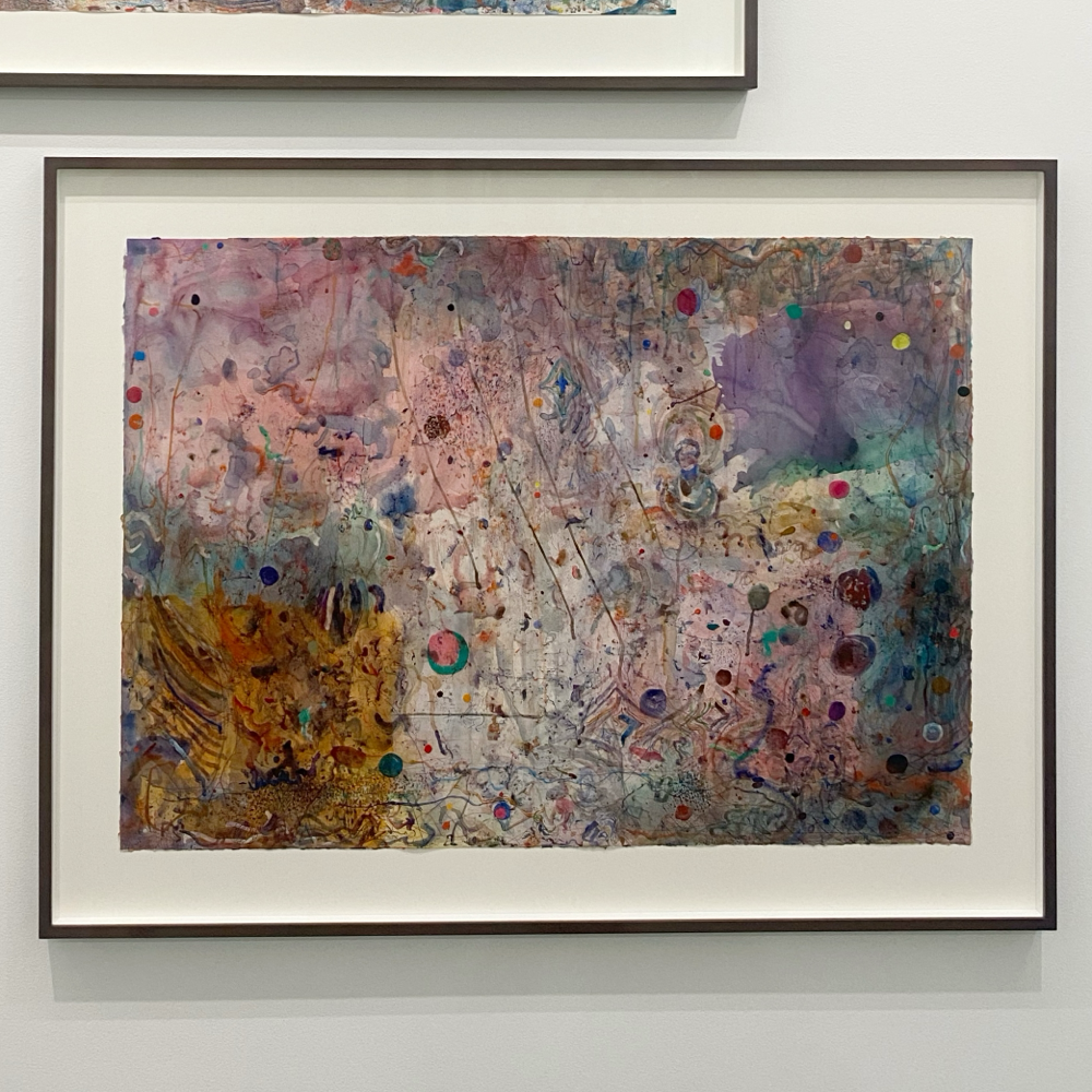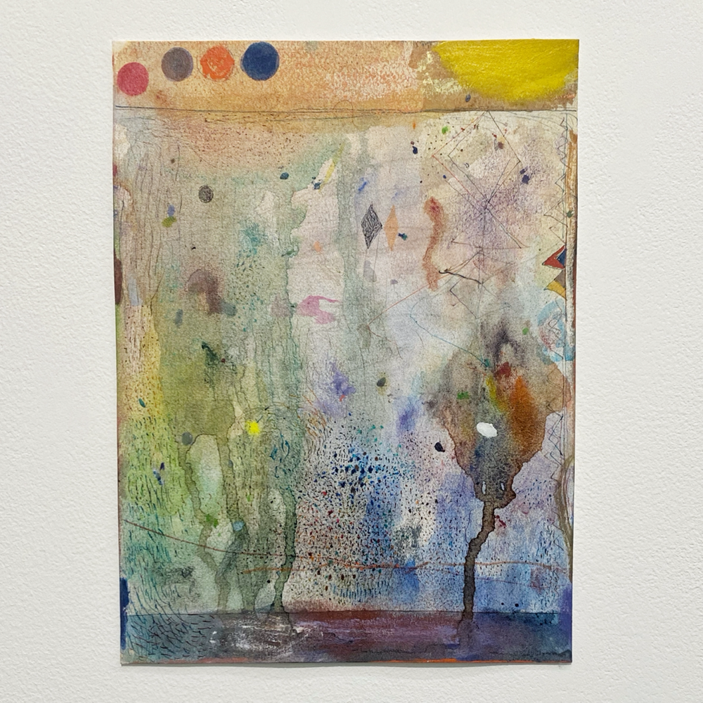ペインティング作品は、絵の具の粒子が紙へ染み込む具合の違いを踏まえて制作されているようで、色の粒を意識したような表現がそこかしこに見られます。