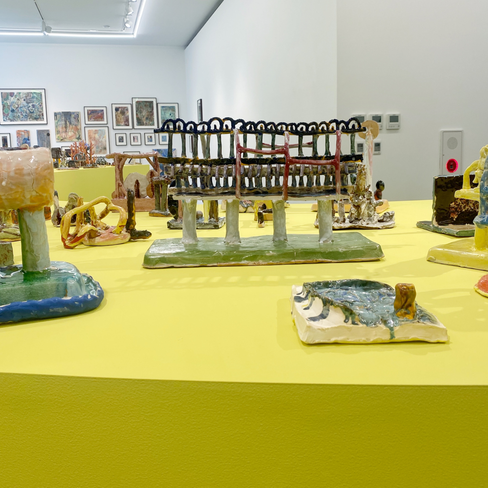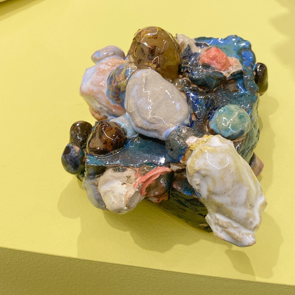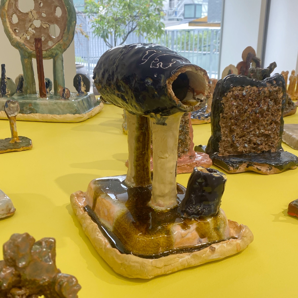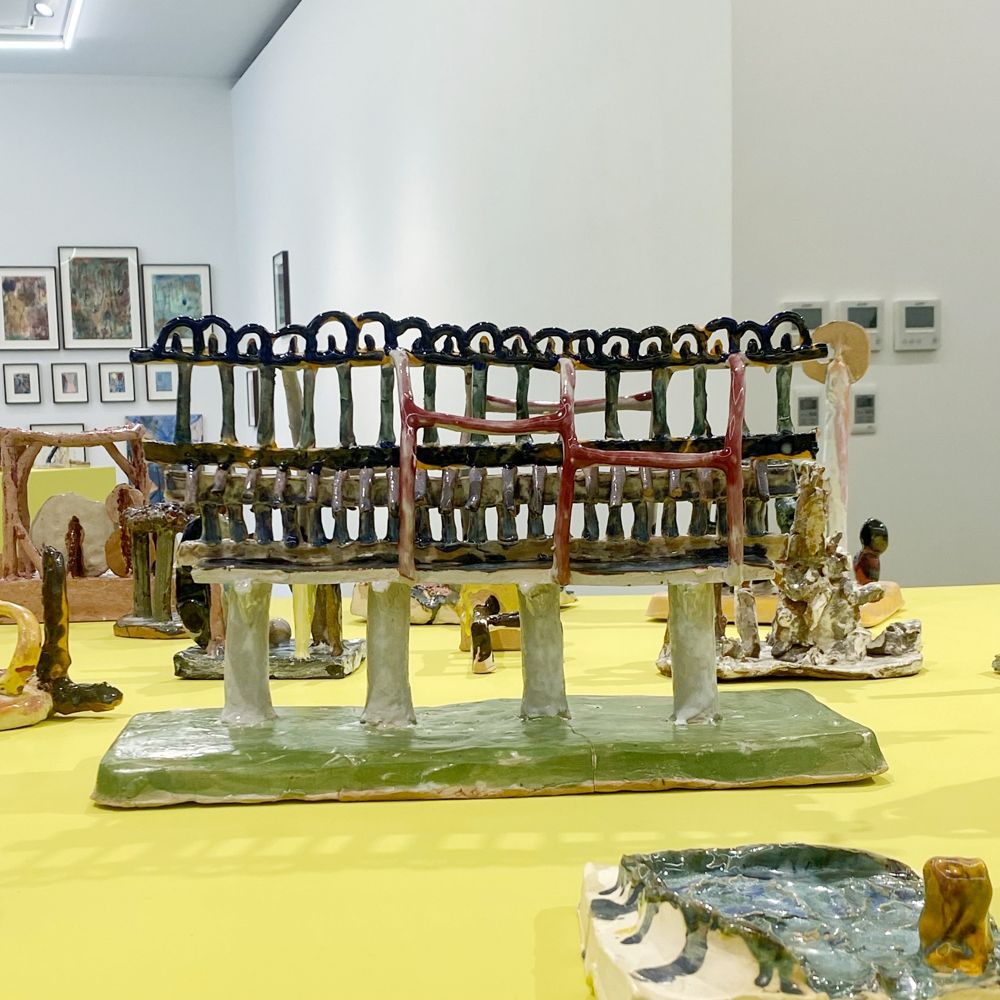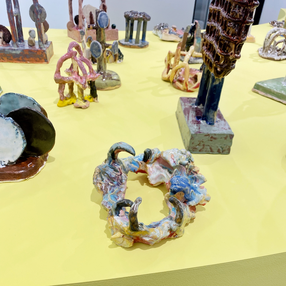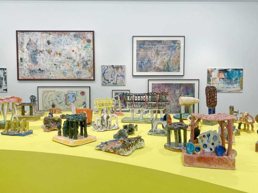 よくよく考えれば、梅津さんの作品は「分からない形状」ばかりです。それでいて、どこかすんなり受け入れてしまうような雰囲気もあります。実際に「これは何ですか?」というような質問を投げている人はあまり見かけませんでした。それは鑑賞者のレベルが高く「ネガティブ・ケイパビリティ」状態で鑑賞出来ていると言えるのかもしれません。私も考えてみれば、よく分からないのだけれども何だか見ていると心地よく、吸い込まれるような世界観です。心地よいけれども、少し距離を取れば、微かに異常さが漂っていることにも気付けます。なぜ、すんなり受け入れてしまうのかについては、作陶に入り浸ることで現地の方から受け取った窯業の美しい釉薬の色であったり、梅津さんが今まで続けてきた美術界に対する批評的な活動と「民藝運動」が呼応して結実したととれる「美術史的読み方」がそうさせるのだと結論づけそうになりますが、それだけではない。もっと言語化が難しいもの、があるはず。
