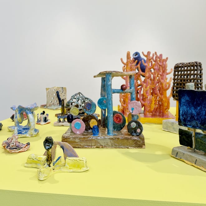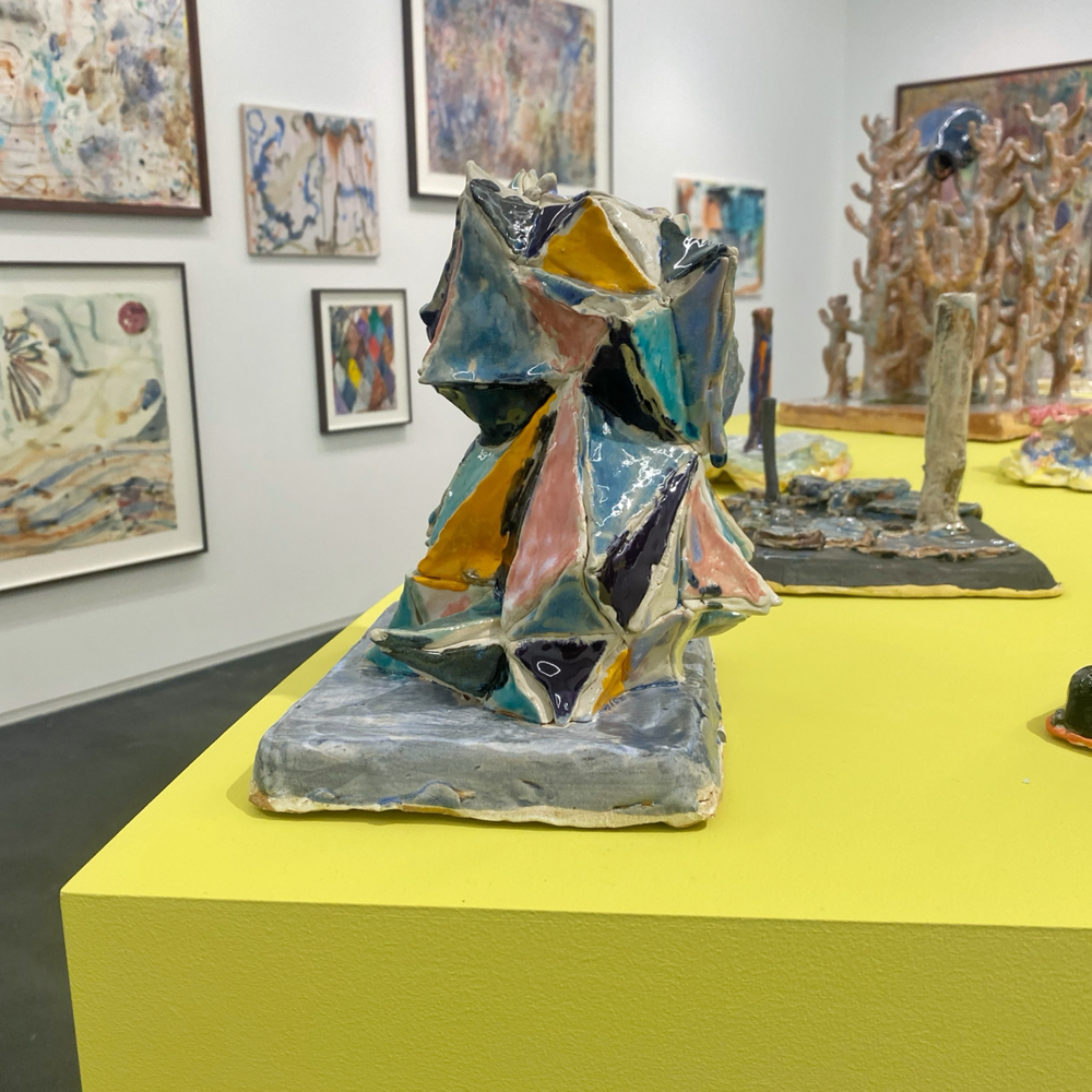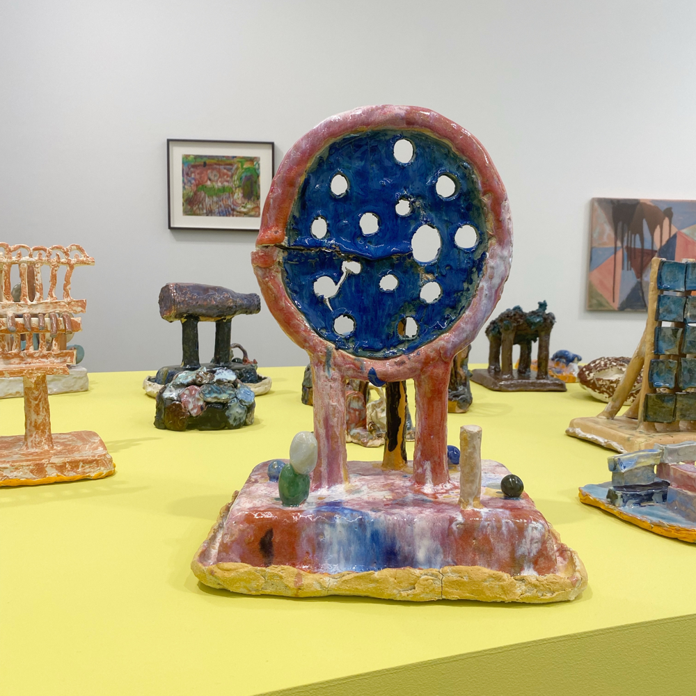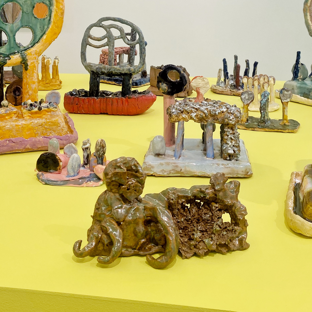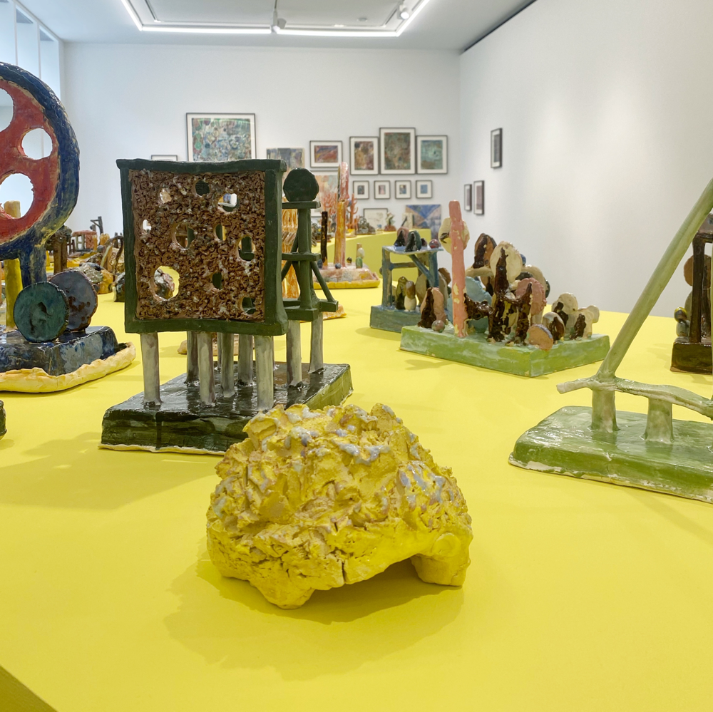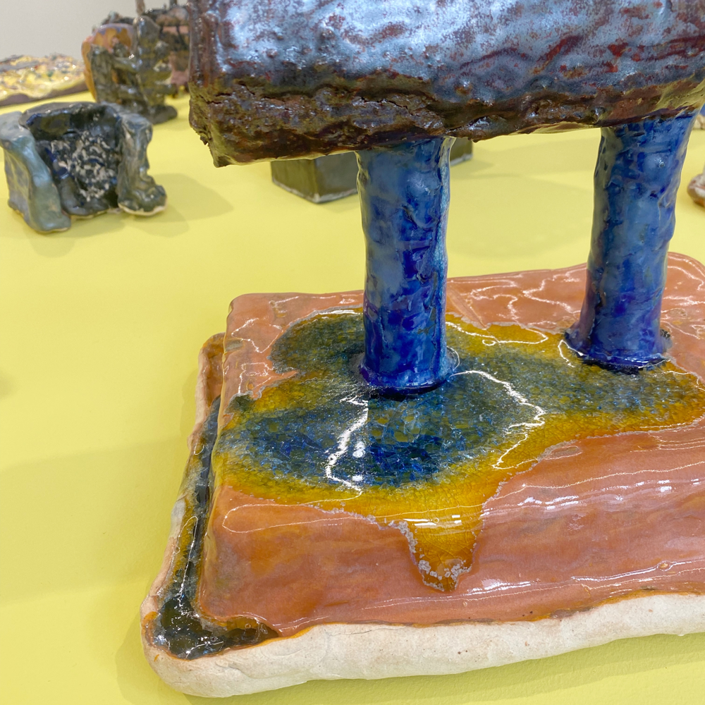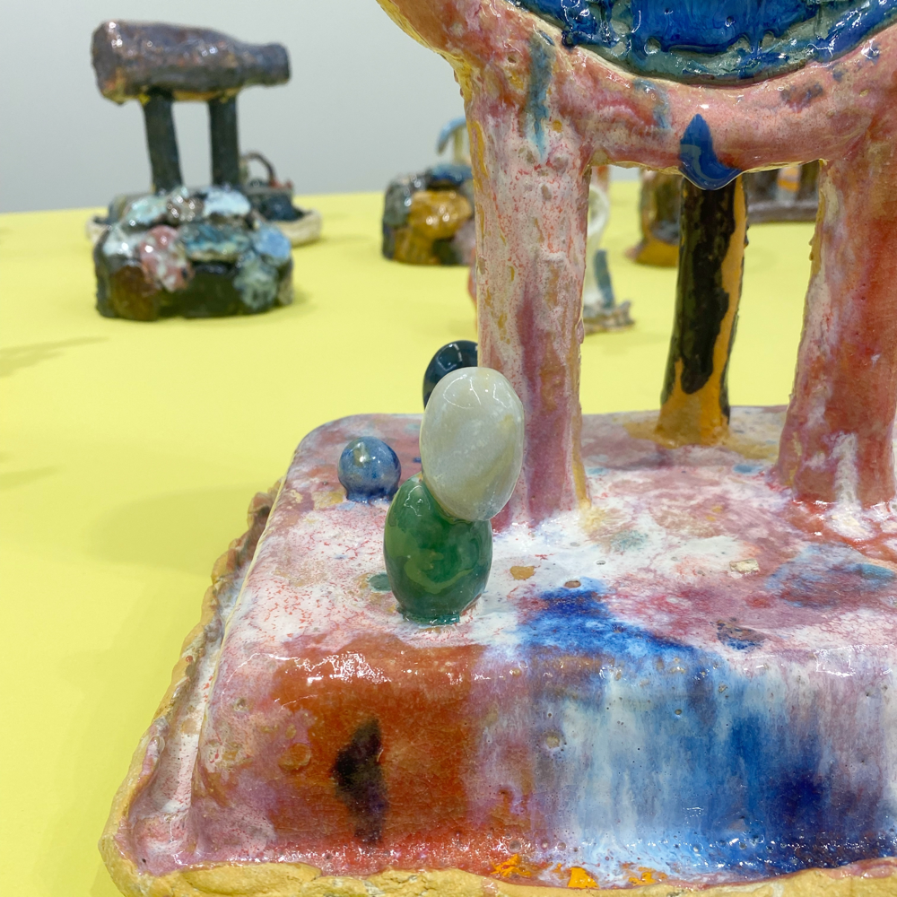 よくよく考えれば、梅津さんの作品は「分からない形状」ばかりです。それでいて、どこかすんなり受け入れてしまうような雰囲気もあります。実際に「これは何ですか?」というような質問を投げている人はあまり見かけませんでした。それは鑑賞者のレベルが高く「ネガティブ・ケイパビリティ」状態で鑑賞出来ていると言えるのかもしれません。私も考えてみれば、よく分からないのだけれども何だか見ていると心地よく、吸い込まれるような世界観です。心地よいけれども、少し距離を取れば、微かに異常さが漂っていることにも気付けます。なぜ、すんなり受け入れてしまうのかについては、作陶に入り浸ることで現地の方から受け取った窯業の美しい釉薬の色であったり、梅津さんが今まで続けてきた美術界に対する批評的な活動と「民藝運動」が呼応して結実したととれる「美術史的読み方」がそうさせるのだと結論づけそうになりますが、それだけではない。もっと言語化が難しいもの、があるはず。
