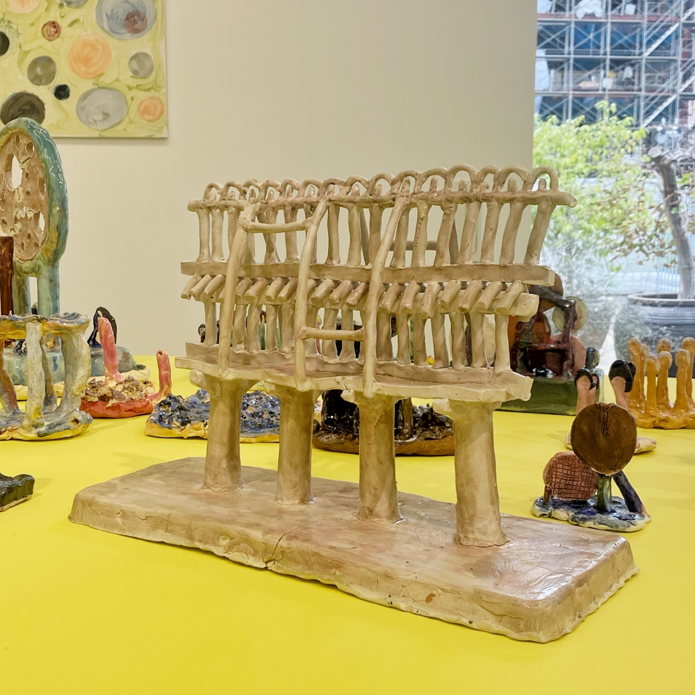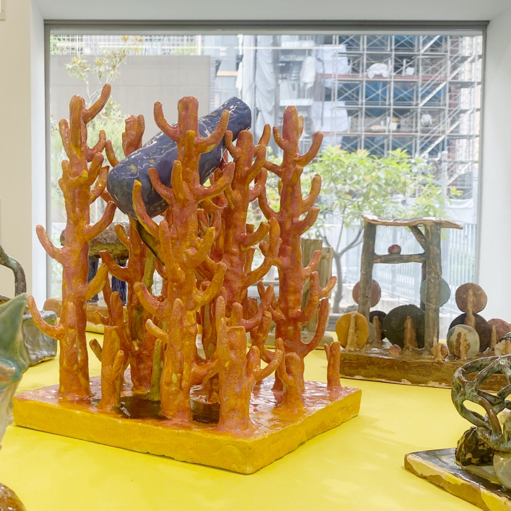梅津さんが作陶の場としている信楽の土は大きな陶作品の焼成に耐え得ることが特徴です。浴槽なども作ることが可能なのだとか。また、一度は目にしたことがある、たぬき、傘立てなども作られています。また、昨今の陶作品ブームにより、著名な美術作家の陶作品が職人の手により制作されているそうです。梅津さんは、たぬき、傘立てのような「手作業だけれども大量に作られる規格品」と「作家本人の手によらない美術作品」(梅津さんはどちらも否定をしている訳ではありません) が制作されている現場に身を置き「自分は自分の手で陶作品を作りたい」という考えのもと、制作をしています。成形の後の乾燥、窯入れ、など時間に余裕がない場面も多い作陶の現場では、24時間休みなく稼働することもあるそうです。(→【パープルームTV】第126回「梅津庸一 ポリネーター アーティストトーク 信楽での作陶の日々を語る Part 1」では50時間というワードも出ています。)